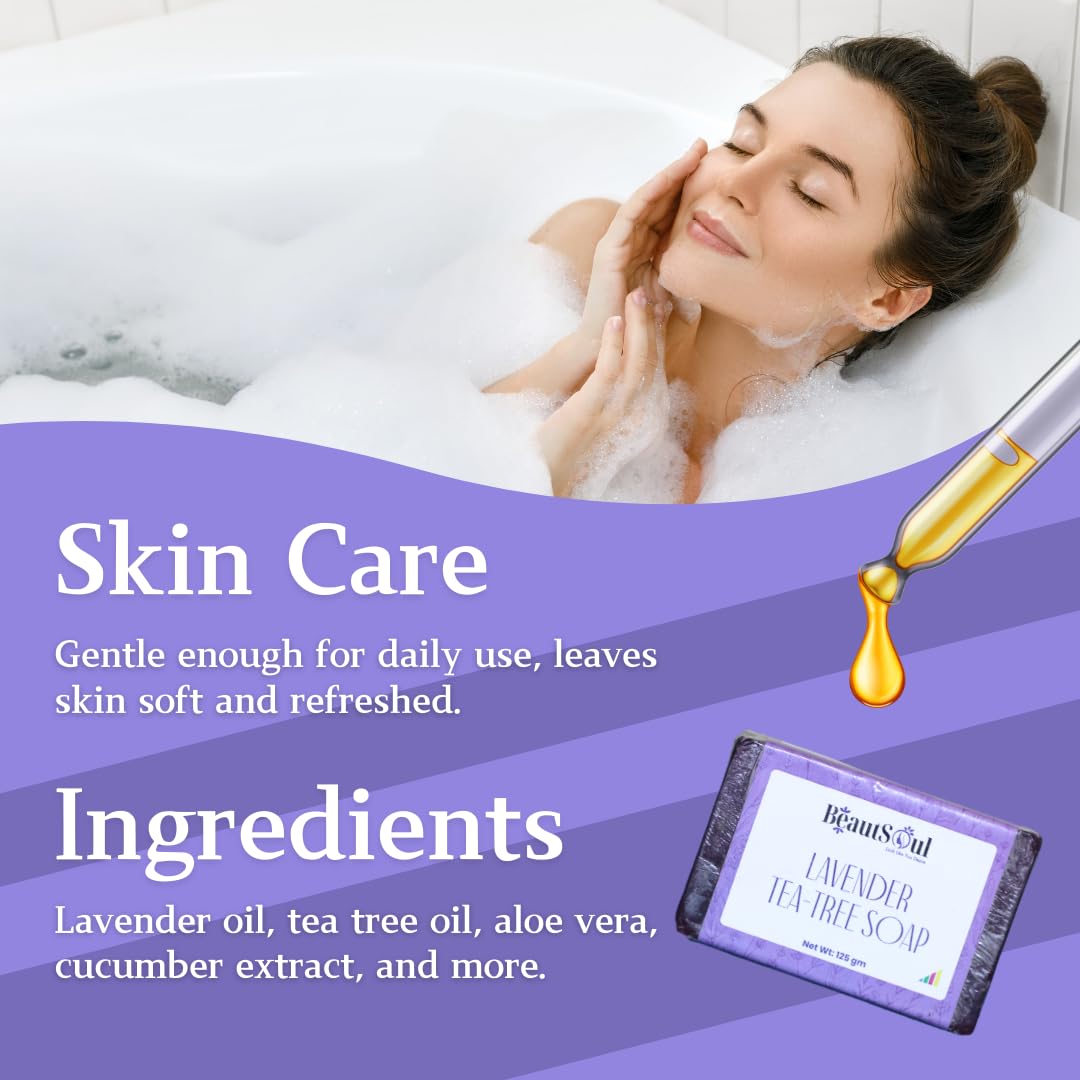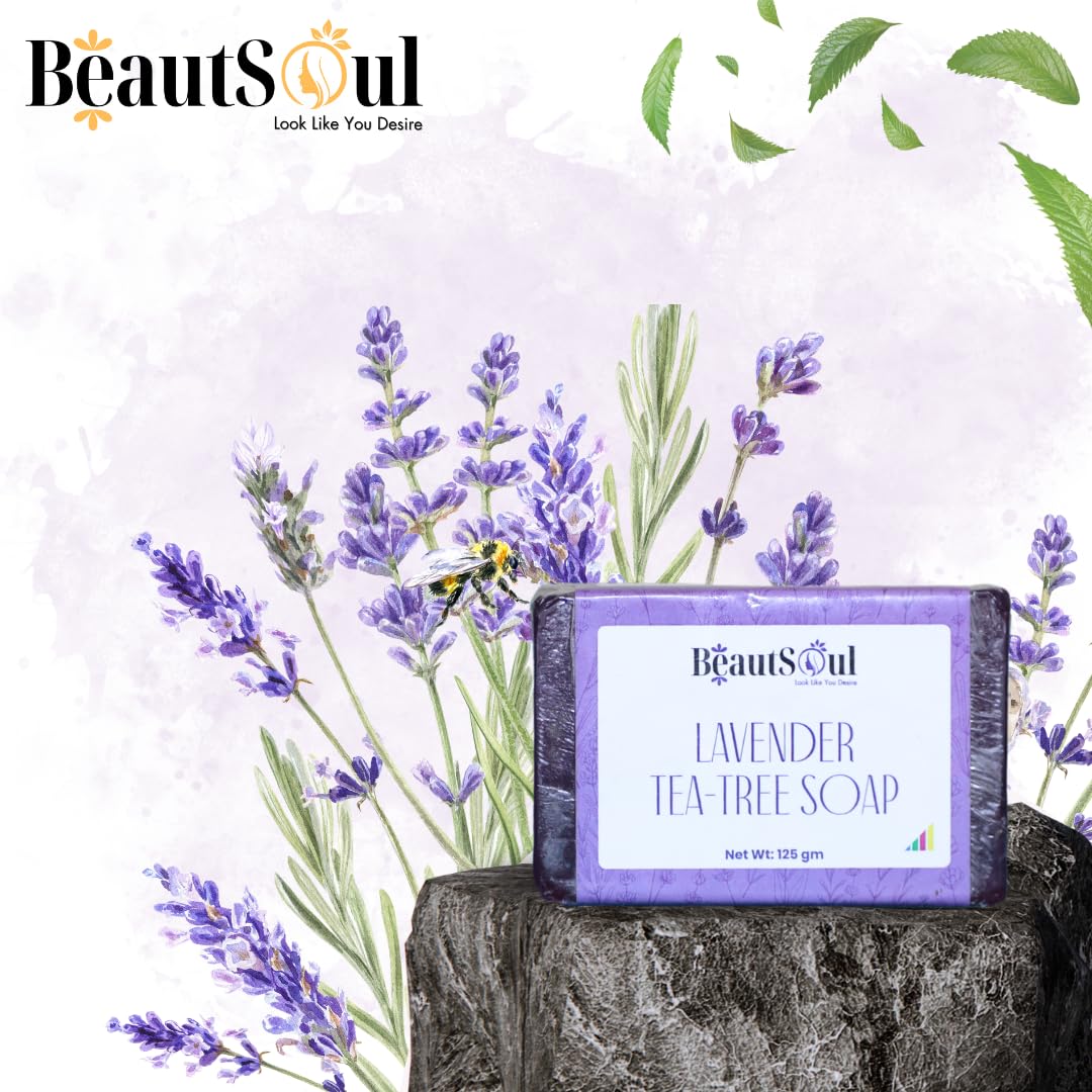 BeautSoul Handmade Lavender &Tea Tree Soap | 100% Natural | Tea Tree Lavender & Patchouli Essential Oils | Relaxing & Calming Soothes Skin & Prevents Acne | Non-drying 125 gram each (pack of 4)