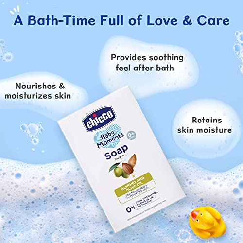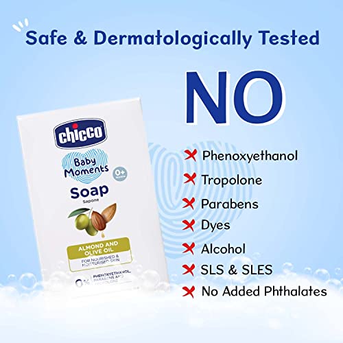 Taking care of the newbornâs daily bathing is an essential care for any new parent. Our New Baby Moments Soap has an Advanced formula that does not contain Phenoxyethanol & Parabens. Moreover it is also free from other harmful toxins & preservatives like Tropolone Mineral oil Dyes Alcohol and No added Phthalates which can adversely impact the babyâs delicate skin. The new Chicco Soap contains a deep moisturizing and hydrating formula that makes the babyâs bathing time filled with nourishment and care. Enriched with the goodness of natural ingredients like Almond oil and Olive oil the soap helps retain skin moisture to prevent dryness. With the formula that also soothes and refreshes the soap is even âBetterâ for newborns. At Chicco we make every effort through our scientific knowledge and global experience of more than 60 years to give the ideal care for babies because we like parents believe that babies deserve the best.