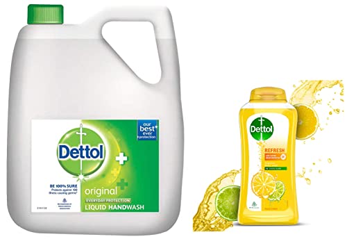 Dettol Original Germ Protection Handwash Liquid Soap Refill 5LBe 100% sure to protect your skin from 100 illness-causing germs and bacteria. Use Dettol's Original Germ Protection Handwash Liquid Soap pH balanced formula every day and keep your hands hygienically clean and refreshed. This hand wash provides soft and rich lather leaving behind clean hands and mild pine fragrance. The trusted germ-protection modus operandi acts like a barrier between your hands and a wide range of unseen germs. The soap-free formula with glycerin makes sure to keep your skin moisturised while the plant derived cleansers help ensure thorough cleaning. Dettol handwash also contains more than 85% naturally derived ingredients with no TCC & Triclosan giving another healthy reason for hand washing whenever in need. Wash hands properly with Dettol and help keep your family healthy! Safety Information: Keep out of reach of children unless under adult supervision. Avoid direct contact with eyes. For external use. In case of contact with eyes rinse immediately with plenty of water. If persistent irritation occurs seek medical attention.Dettol Body Wash and Shower Gel for Women and Men Refresh - 250ml | Soap-Free Bodywash | 12h Odour ProtectionDettol Hygiene Body wash Refresh combines Dettolâs trusted germ protection with refreshing citrus fragrance and leaves your skin feeling fresh.