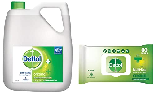 Dettol Original Germ Protection Handwash Liquid Soap Refill 5LBe 100% sure to protect your skin from 100 illness-causing germs and bacteria. Use Dettol's Original Germ Protection Handwash Liquid Soap pH balanced formula every day and keep your hands hygienically clean and refreshed. This hand wash provides soft and rich lather leaving behind clean hands and mild pine fragrance. The trusted germ-protection modus operandi acts like a barrier between your hands and a wide range of unseen germs. The soap-free formula with glycerin makes sure to keep your skin moisturised while the plant derived cleansers help ensure thorough cleaning. Dettol handwash also contains more than 85% naturally derived ingredients with no TCC & Triclosan giving another healthy reason for hand washing whenever in need. Wash hands properly with Dettol and help keep your family healthy! Safety Information: Keep out of reach of children unless under adult supervision. Avoid direct contact with eyes. For external use. In case of contact with eyes rinse immediately with plenty of water. If persistent irritation occurs seek medical attention.Dettol Disinfectant Sanitizer Wet Wipes for Skin & Surfaces Original â 80 Count| Moisture-Lock Lid | Safe on Skin | Ideal to Clean SurfacesDettol's Disinfecting Skin & Surface Wipes are Safe on Skin Ideal to Clean Multiple Surfaces Easy to carry with a resealable Moisture-lock lid. Dettol disinfecting wipes are practical for everyday use on furniture fridges taps sinks door knobs kitchen bathroom surfaces floor cleaning childrenâs surfaces and electronics that are germ hotspots. It can be used on most hard non-porous surfaces including Finished Wood Sealed Marble Stainless Steel Laminated Floors Glass and Plastic.