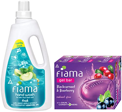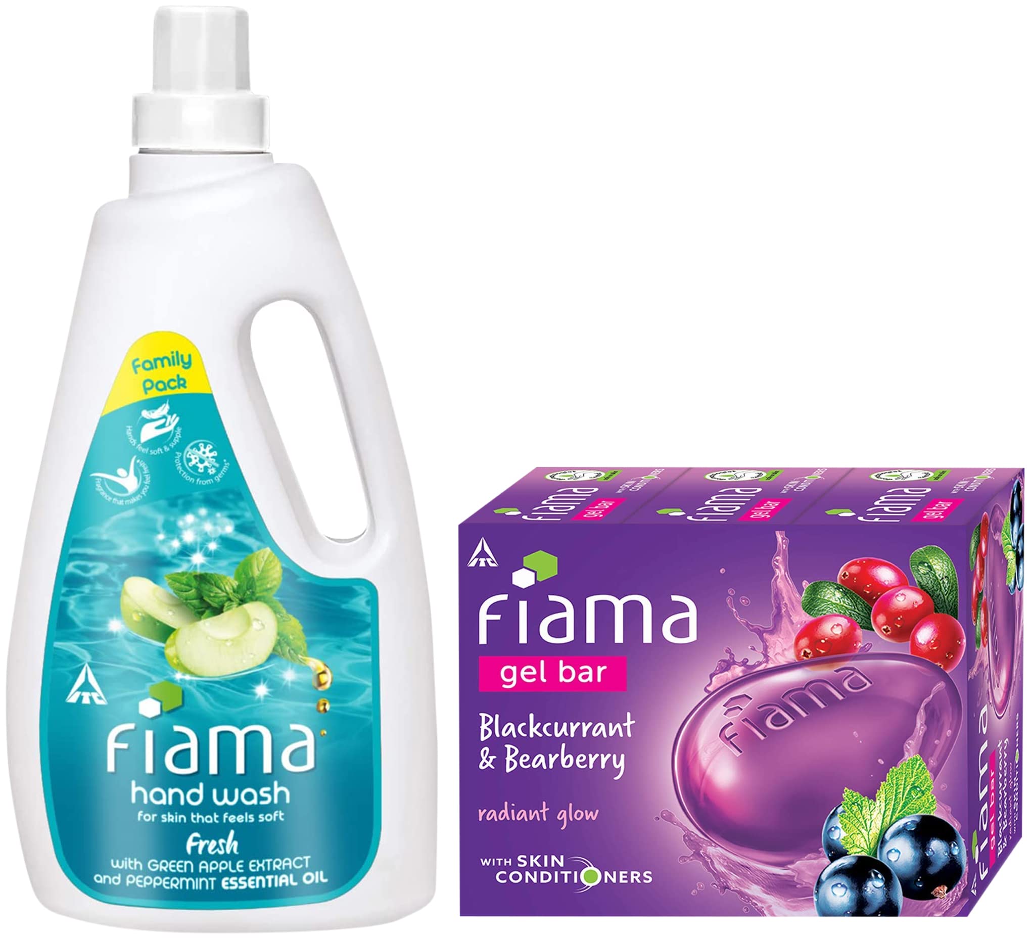 Fiama Fresh Moisturizing hand wash Peppermint and Green Apple 1000ml refill packFiama liquid handwash contains fragrance that is proven to make you feel fresh. The gel formulation contains skin conditioners that make your hands soft and has natural germ protection to keep your hands safe. Available in 3 variants - happy relax and fresh.Fiama Gel Bar Blackcurrant And Bearberry for Radiant Glowing Skin With Skin Conditioners 125g soap (Pack Of 3)Wash away the troubles of your day with the foamy fresh and fun Fiama Gel Bar. And while you enjoy your Fiama bath let its skin-conditioners work their magic to give your skin a radiant glow. This Blackcurrant and Bearberry gel bar has an indulgent fragrance that transforms a normal shower into a spa-like experience. It is filled with goodness of natural ingredients which helps your skin glow. So get ready to make every bath a highlight of your day.
