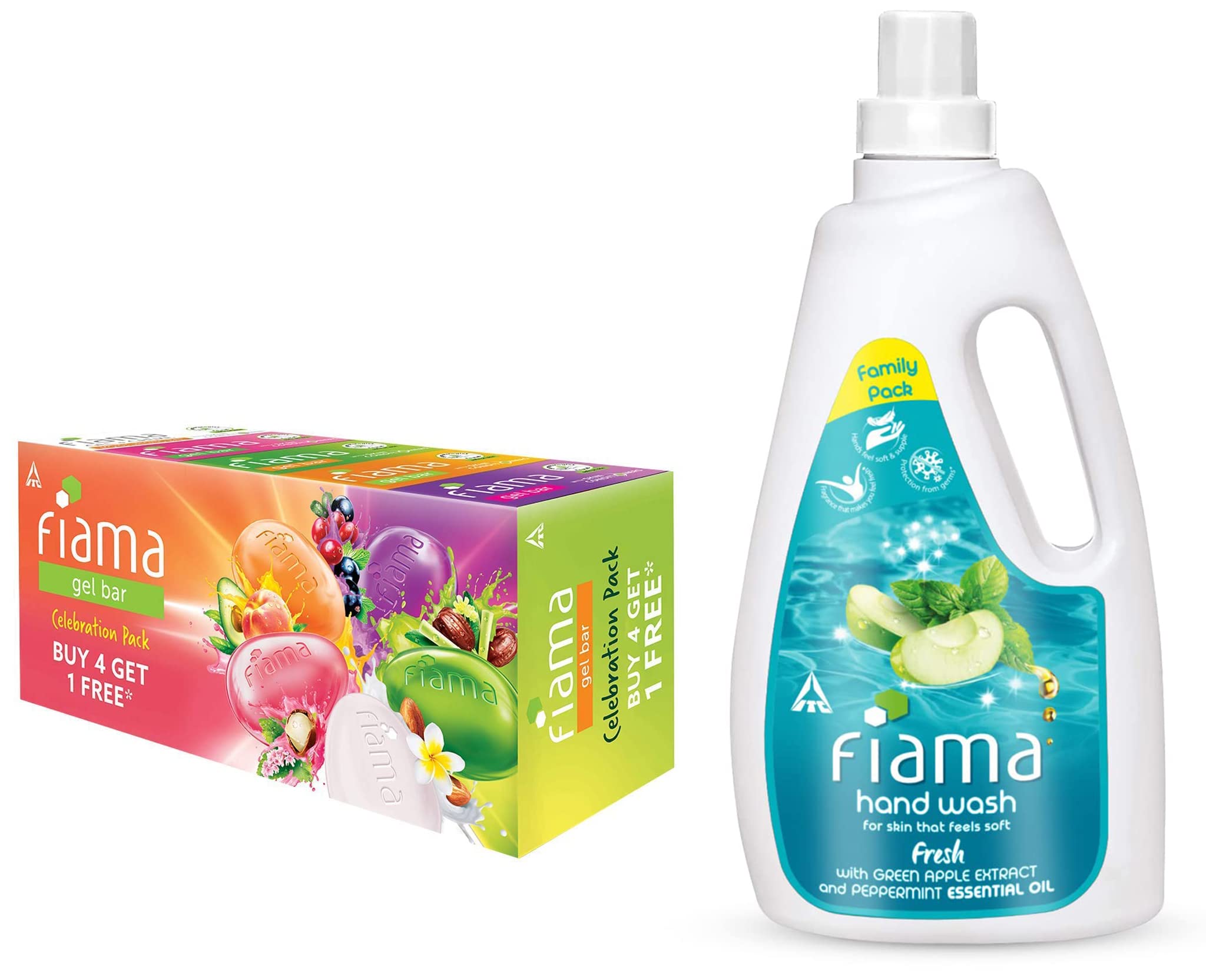 Fiama Gel Bar Celebration Pack With 5 unique Gel Bars & Skin Conditioners For Moisturized Skin 125g Soap (Buy 4 Get 1 Free)The product comes in safe package. The product will be an excellent pick for you.Fiama Fresh Moisturizing hand wash Peppermint and Green Apple 1000ml refill packFiama liquid handwash contains fragrance that is proven to make you feel fresh. The gel formulation contains skin conditioners that make your hands soft and has natural germ protection to keep your hands safe. Available in 3 variants - happy relax and fresh.
