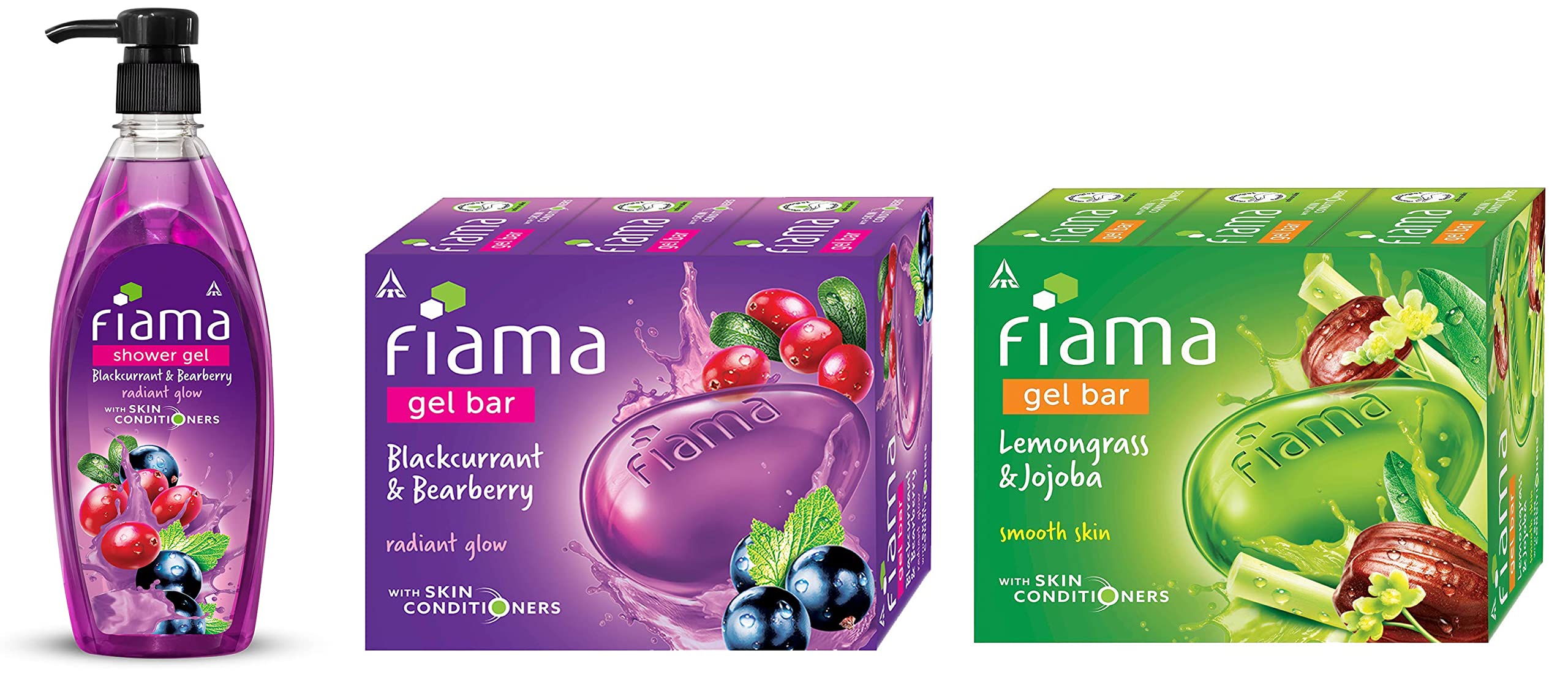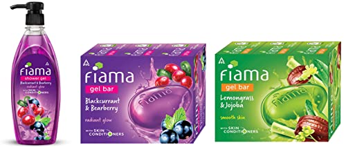Fiama Shower Gel Bearberry and Blackcurrant 500mlWash away the troubles of your day with the foamy fresh and fun Fiama Body Wash. And while you enjoy your Fiama bath let its skin-conditioners work their magic to give your skin a radiant glow.This Blackcurrant and Bearberry shower gel has an indulgent fragrance that transforms a normal shower into a spa-like experience. It is filled with goodness of natural ingredients which helps your skin glow. So get ready to make every bath a highlight of your day.Fiama Gel Bar Blackcurrant And Bearberry for Radiant Glowing Skin With Skin Conditioners 125g soap (Pack Of 3)Wash away the troubles of your day with the foamy fresh and fun Fiama Gel Bar. And while you enjoy your Fiama bath let its skin-conditioners work their magic to give your skin a radiant glow. This Blackcurrant and Bearberry gel bar has an indulgent fragrance that transforms a normal shower into a spa-like experience. It is filled with goodness of natural ingredients which helps your skin glow. So get ready to make every bath a highlight of your day.Fiama Gel Bar Lemongrass And Jojoba for Smooth Skin With Skin Conditioners 125g (Pack Of 3)Wash away the troubles of your day with the foamy fresh and fun Fiama Gel Bar. And while you enjoy your Fiama bath let its skin-conditioners work their magic to make your skin soft and smooth. This Lemongrass and Jojoba gel bar wakes you up and pulls you out of a dull day with its zingy citrus fragrance. It is filled with natural goodness that makes your skin soft and smooth. So get ready for a smooth start to your day with Fiama.