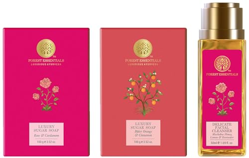 Forest Essentials Luxury Sugar Soap Rose & Forest Essentials Delicate Facial Cleanser Mashobra Honey, Lemon & Forest Essentials Luxury Sugar Soap Bitter Orange & Cinnamon Ayurvedic