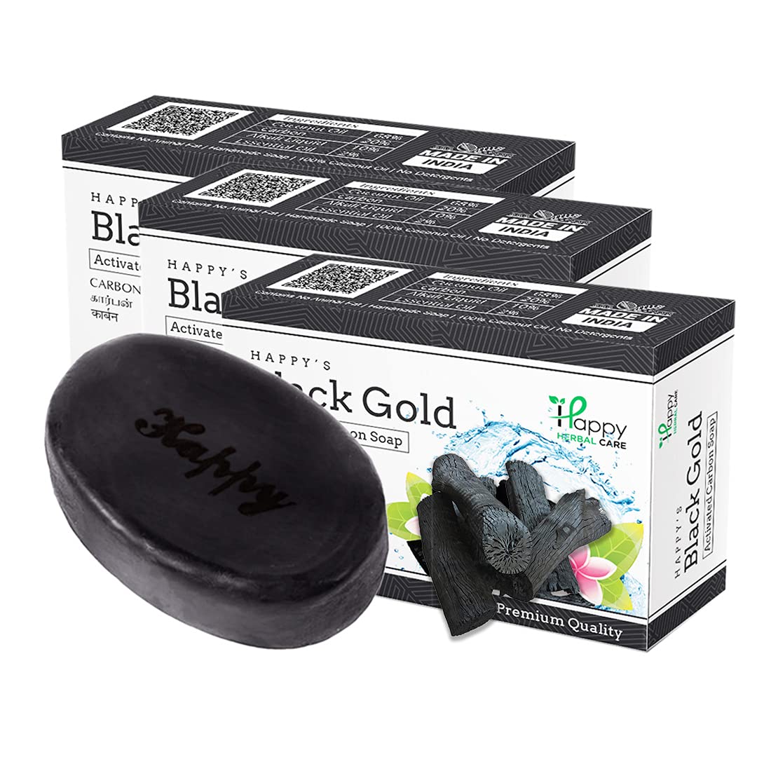 HomeBeautyBodyBath & ShowerSoapsHappy Herbal Care ACTIVATED CHARCOAL Hand Made Soap 75gm - For Skin Whitening Acne Blackheads Anti Wrinkle Anti Pollution Pimple (Pack of 3)