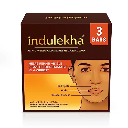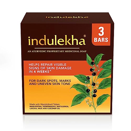 Indulekha soap bar is an Ayurvedic Proprietary Medicine Soap that helps repair visible signs of skin damage in 4 weeks*. It is not a regular soap but an ayurvedic medicine for your skin. The Soap is formulated with potent Ayurvedic ingredients that are known to help with skin concerns such as dark spots marks uneven skin tone and pore appearance. 84% of users in the clinical study showed improvement from visible signs of skin damage*. This potent bar is made with Manjishthadi Tailam which is a unique combination of four Ayurvedic ingredients namely Manjishtha (Indian Madder) Yashtimadhu (Liquorice) Matulunga (Citron) and Laksha (Lac). In Ayurveda the use of Manjishthadi Tailam is known to cure minor skin problems improves skin health & provides a golden glowing skin. It is also known in ayurveda to treat skin inflammation like boils acne & to reduce the appearance of dark patches by inhibiting tyrosinase enzyme a key regulator in melanin production on skin as known in modern science . The soap also helps in the reduction of sebum secretion and improvement in hydration that is known to mange excess oiliness on skin and formation of acne lesion*. As per Ayurveda excessive oiliness is the result of imbalance occurring in the pitta doshas where cleansing with lukewarm water and using a balanced formulation containing pitta pacifying herbs such as Manjishtha & Yashtimadhu are known to help in the oily skin care management?. For glowing skin use 2 times a day for 4 weeks because regular usage of products is recommended in Ayurveda. *Based on clinical study conducted by an independent research organization in 2021.