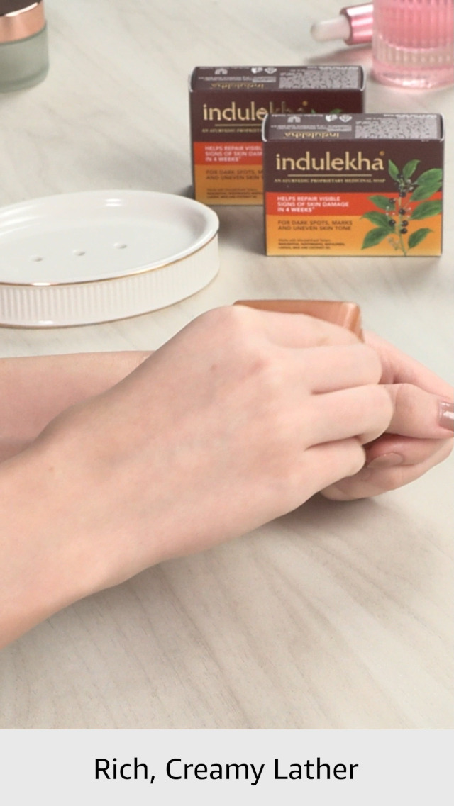 • Indulekha soap bar is an Ayurvedic Proprietary Medicine Soap that helps repair visible signs of skin damage in 4 weeks*