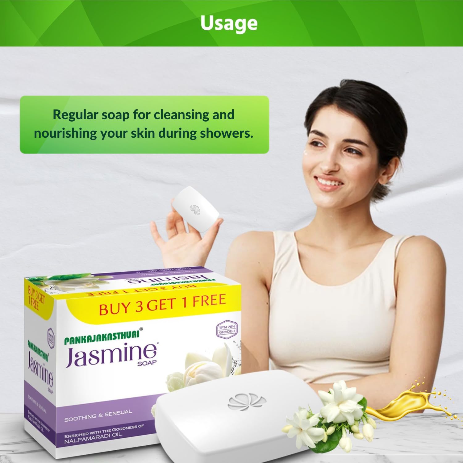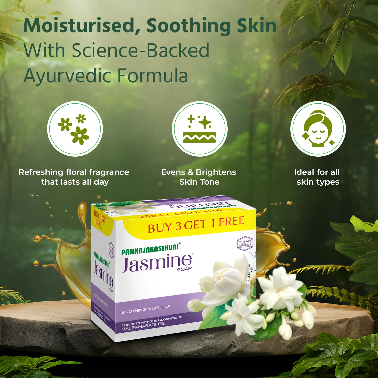 Indulge in the luxurious experience of Pankajakasthuri Jasmine Soap a premium bathing soap that combines traditional wisdom with modern sophistication. Each 75-gram bar is enriched with the classical Nalpamaradi Oil blend featuring precious ingredients like coconut oil sandalwood vetiver amla and turmeric. The enchanting fragrance of jasmine flowers creates a delightful sensory experience while cleansing. This meticulously crafted soap contains a rich blend of natural extracts including Haritaki Vibhitaki Agar Wood White Turmeric Manjishta and various fig varieties. With a high TFM (Total Fatty Matter) of 76% this soap offers superior cleansing while helping maintain soft clear skin. Available in convenient multi-pack options this sulphate-free and phthalate-free soap brings the goodness of traditional ingredients to your daily skincare routine. Each bar is thoughtfully formulated to help you achieve bright clear and soft skin through regular use.