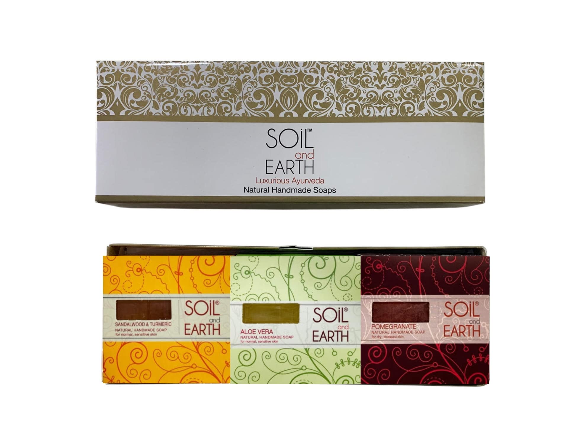 HomeBeautyBodyBath & ShowerSoapsSoil and Earth Handmade Natural Cold-Pressed Soap Gift Box- SANDALWOOD ALOEVERA POMEGRANATE- NO SILICONES & PARABENS 3 X 125 gm/ 4.4 oz.