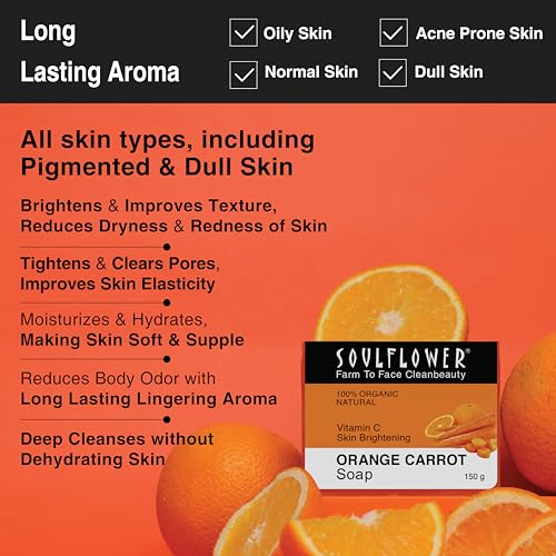 Rich in vitamin a beta-carotene and antioxidants properties this soap rejuvenates mature skin; A safe and secure soap for your skin: soulflower orange carrot soap is pure natural and cold processed which is also free from sls chemicals synthetic colour or