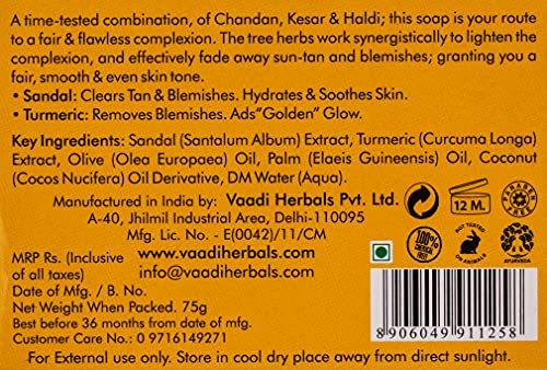 A timetested combination of chandan kesar and haldi this soap is your route to a fair and flawless complexion. The three herbs work synergistically to lighten the complexion and effectively fade away suntan and blemishes granting you a fair smooth and even skin tone.Why is skin-care essential? Skin is the largest organ that acts as a shield protecting one from external factors. Skin care is most-talked about topic among people but its rather sad that people still ignore it. Major skin problems that people encounter are:Rashes Black heads Pimples Black Spots and other skin eruptions.Skin Tanning wrinkles early aging.Dry Skin loss of essential skin oils.Solution to all such problems is a product with combination of some of the best natural ingredients which help in cleansing the skin without being harsh on it.How is Sandal Oil (Chandan) beneficial for the skin?This fragrant oil is extracted from the Santalum trees which are found in the Indian Sub-continent Indonesia Australia and Pacific Islands. The Australian and Indian Sandalwood (also called Santalum album) are regarded as the best. Sandalwood Oil is notable for the following:ANTISEPTIC QUALITY: Sandal oil has an excellent antiseptic quality and cooling effect which prevents rashes blackheads eruptions and allergies. Cuts and wounds heal faster with application of sandal oil.NATURAL SKIN TONER & ASTRINGENTGERMICIDAL QUALITYSOFTENS and MOISTURISES the skinHow does Saffron bring out a flawless beautiful YOU?Crocus sativus or the Saffron Crocus is the spice from which Saffron extracts are taken. Saffron cultivation is mostly found in Kashmir Spain and Greece where it depends on the rainfall. The main region for cultivation is Iran.WHITENING and EXFOLIATINGIMPARTS A GLOWENHANCES SKIN TEXTURE.What is special about Turmeric?Growing mostly in South Asia Curcuma longa or Turmeric is a great herb for the skin. It's medicinal properties make it the most-sought herb of all times.REDUCES INFLAMATIONPREVENTS PIMPLESACNES.CLEARS SCARS AND BLEMISHES.