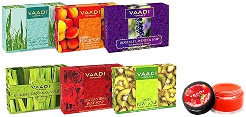 VAADI HERBALS Exotic Flavors Luxurious Handmade Herbals Soaps, 75g (Pack of 6) & Lip Balm, Strawberry and Honey, 10g