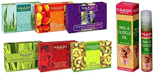 VAADI HERBALS Exotic Flavors Luxurious Handmade Herbals Soaps, 75g (Pack of 6) & Nail and Cuticle Oil with Jojoba Oil, 10ml
