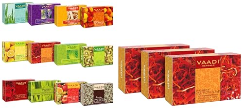 VAADI HERBALS Value Luxurious Saffron Skin Whitening Therapy Soap 75g (Pack of 3) & Assorted Luxurious Handmade Herbal Soaps 75g (Pack of 12)