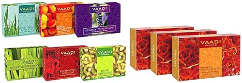 VAADI HERBALS Value Luxurious Saffron Skin Whitening Therapy Soap 75g (Pack of 3) & Exotic Flavors Luxurious Handmade Herbals Soaps 75g (Pack of 6)