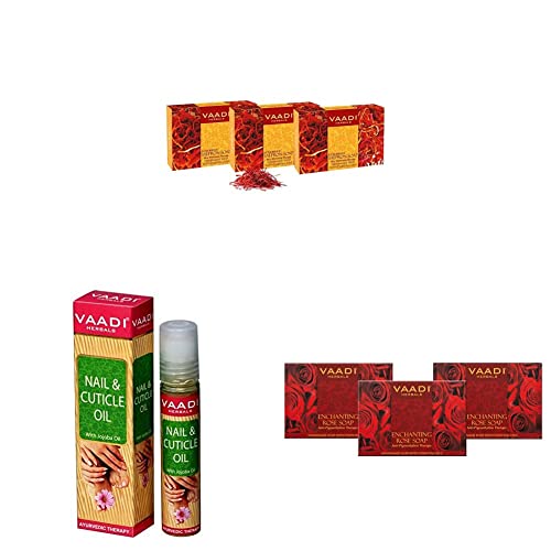 Vaadi Herbals Value Luxurious Saffron Skin Whitening Therapy Soap 75g (Pack of 3)Enriched with multi mineral rich content of saffron and goat milk this soap lightens and evens your skin tone while cleansing away poredeep impurities. It gently fades away pigmentation marks and blemishes and grants you a fairer and flawless complexion.What are the causes of a lack-luster complexion and skin-darkening?Regular sun exposure water sports unhealthy eating habits and lack of a proper skin care regime ends up making the skin unattractive blotchy and possess an uncared for look. Excessive oiliness leads to acne which further deteriorates the condition of the skin marring the texture and complexion in one go. Acne leaves scars which make the skin appear unhealthy and not worth an appreciation. If the skin is excessively dry dry patches are formed and this also triggers premature skin aging. Wrinkles fine lines discoloration pigmentation and freckles mar the beauty of your youthful beautiful and healthy skin. Sun's UV rays trigger the production of melanin which keeps the skin from skin cancer. This melanin production leads to the darkening of the skin contour.What are the benefits of Goat Milk?Goat Milk is known to be a great natural cleanser. Dehydrated dry and parched skin gets an instantaneous respite by use of goal milk extracts. Having excellent emollient properties Goat Milk is an effective moisturizer that nourishes and cares for the skin like no other making it soft supple and beautiful.This Skin Whitening Therapy containing Goat Milk seeps deep in the skin's layers and hydrates the skin without clogging the pores. Goat Milk extracts contain alpha-hydroxy acids that rejuvenate the skin by exfoliation which thereby simulates the regeneration of new skin cells. With regular application the skin becomes velvety soft and a rosy perfume accompanies you always.How does Saffron whiten and brighten the skin?Found Iran and also cultivated in Kashmir Spain and Greece Crocus sativus or simply Saffron is a medicinal herb which is very well known for its soothing properties and tremendous uses. Saffron helps in deeply exfoliating the pores giving you a cleansed fresh and flawless skin.Scars sun spots dark patches and blemishes fade quickly as saffron acts under the skin's epidermal layer healing and rejuvenating the skin from within and imparting a healthy glow on the outside. Toning the skin curing burns rashes and allergies Saffron safeguards the skin from further damage by acting as a shield. Saffron moistens the skin to prevent dryness and itching thereby enhancing the texture.Vaadi Herbals Nail and Cuticle Oil with Jojoba Oil 10mlAn excellent way to moisturise and condition the nails and cuticle area. It mainly strengthens thin weak nails by treating damaged cuticles at the root. It also prevents cracking and peeling of cuticles making them smooth and nourished. Why Use Cuticle Oil? Cuticle oil is used to moisturize the cuticle skin and nail area. It can protect the cuticle and nail against damage and improve the health and appearance of the cuticles and nails. Cuticle oil should not be used as a first-line of defense against dryness but rather to fix extremely dry cracked nails. Made of natural rapidly absorbing vegetable oils cuticle oil can also contain vitamins and citric acid. Protect and Repair Action Cuticle oil can help protect and repair damage to the cuticles. When cuticles are exposed to excessive cold sun chlorination salty or soap water or other environmental conditions that lead to dry chapped skin the cuticles can be also become dry chapped and damaged. Similarly picking at the cuticles typing folding laundry brushing hair and cooking can all cause damage. Moisturize and Pamper Action The main purpose of cuticle oil is to deeply moisturize not only the cuticle but also the skin and surrounding nail area. Cuticle oil helps increase circulation in the nail bed and can stimulate new nail growth. When cuticles or the surrounding nail are extremely dry and cracked to the point of separation of the nail area from the cuticle the oil provides quick repair and protection. The oil deeply moisturizes the area repairs the nail stops the cracking and eventually allows the nail to reattach. What is Jojoba Oil? Jojoba oil is produced in the seed of the jojoba plant a shrub native to southern Arizona southern California and northwestern Mexico. Jojoba oil has been commonly used is to treat and repair nails. It is indicated to treat splitting or peeling nails or nails with vertical ridges. Vertical nail separation or splitting indicates a lack of moisture or body oils in the nails. Topical application of Jojoba oil to the nail plate and cuticle penetrates and softens the nail making it more supple and less likely to crack. In addition Jojoba oil helps in the absorption of Vitamin E in order to aid conditioning of nails. Jojoba oil has also been shown to not only soften the nail plate to allow more penetration but it also has been shown to include antifungal properties of its own. Taking Care of your Nails with Jojoba Why do we use jojoba oil? Brittle layer or ribbed nails dry and sensitive skin of hands are the reasons for using jojoba oil Reasons for the problems with nails.Vaadi Herbals Enchanting Rose Soap with Mulberry Extract 75gx3A powerful anti pigmentation formula this soap clears dark spots and patches off your skin as it cleanses it. English roses astringency and rich vitamin C content help fade pigmentation marks while mulberrys arbutin inhibits melanin synthesis thus preventing pigmentation. Natural Soap v/s Chemical Soaps When we go to market to choose soap suitable for the skin we may have an option of over thousand of variety of soaps. Fragrances play a very important role. No one prefers a soap with an unpleasant odor. But the chemical soaps available in the market at high prices falsely claim to be benefiting the skin. The chemical ingredients which are added to improve the skin pro