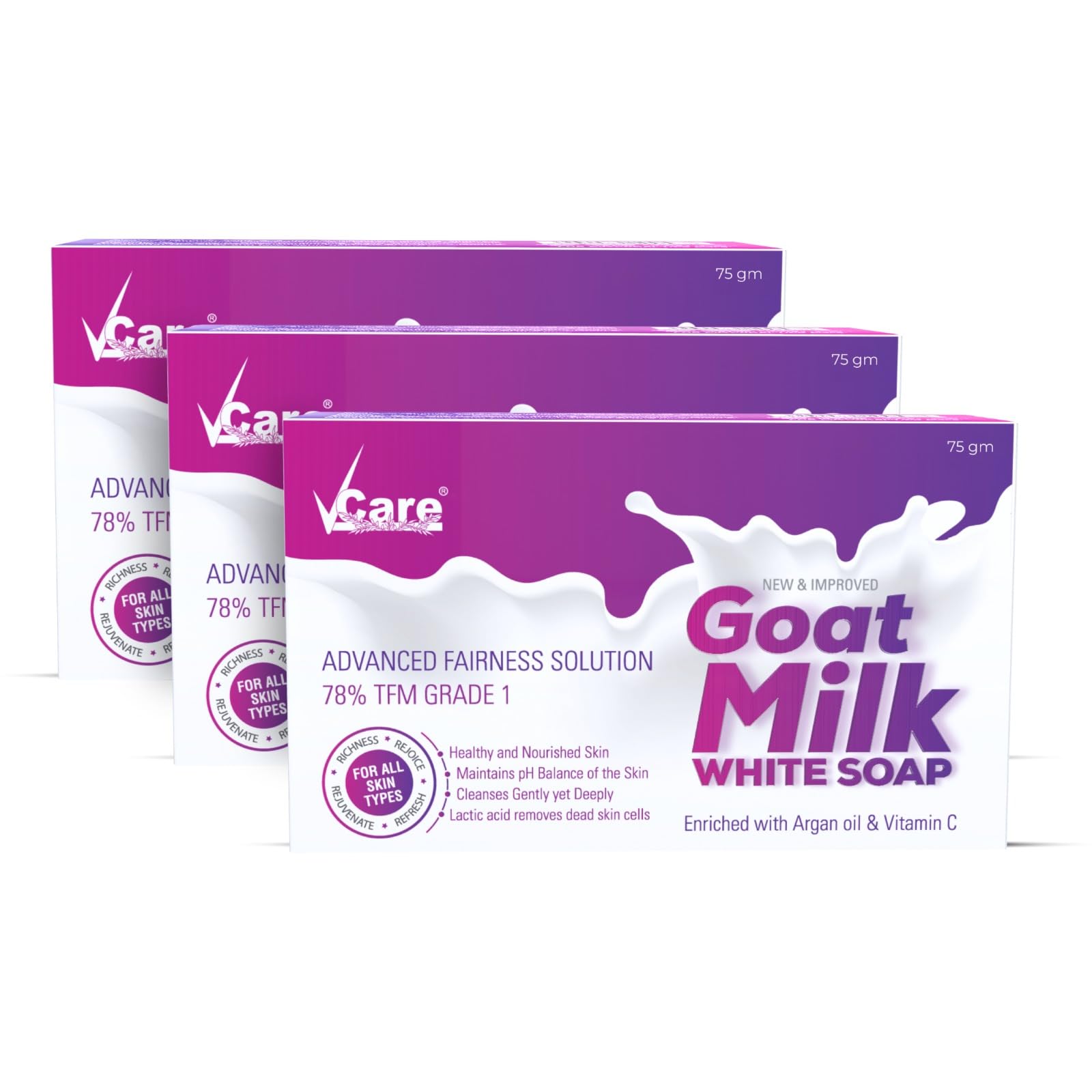 VCare Goat Milk Soap For Women & Men with Vitamin C Argan Oil for Deep Exfoliation and provides hydration | Sulfate & Paraben Free Bathing Soap Bar - 75 gms (Pack of 3)
