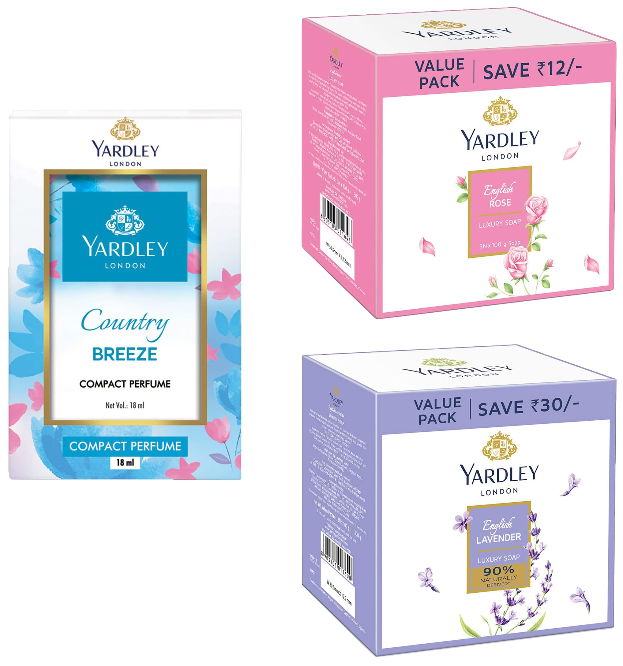 Yardley London English Lavender Luxury Soap100g (Pack Of 3) & Yardley London Country Breeze Compact Perfume for Women 18ml & Yardley London English Rose Luxury Soap100g (Pack Of 3)