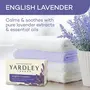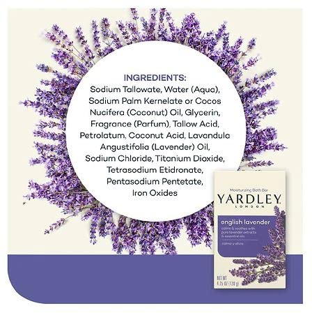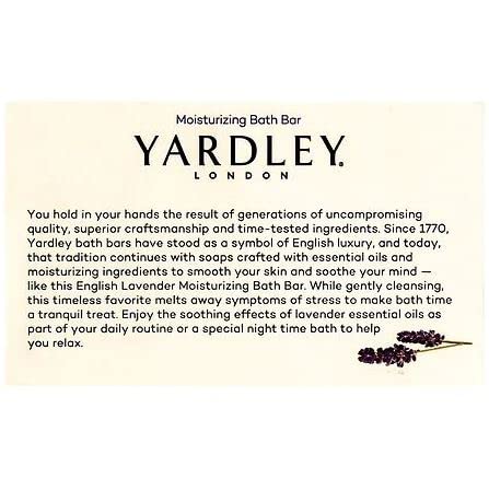 Yardley London English Lavender with Essential Oils Bar Soap 4.25 oz. Naturally moisturizing bath bar. With pure lavender extracts & essential oils. Calms & soothes. Since 1770 the House of Yardley London has created fine luxury soaps worthy of royalty. Today the tradition continues with Yardley's English Lavender Naturally Moisturizing Bath Bar. Capture the calming and soothing properties of pure lavender. Breathe in Lavender essential oils as part of your daily routine or special night time bathing ritual. While gently cleansing this timeless favorite melts away symptoms of stress to make bath time a tranquil treat. All Yardley Naturally Moisturizing Bath Bars are paraben free & sodium lauryl sulfate free. Est'd 1770. William Yardley first created natural lavender soaps for all of London in the 17th century. Today Yardley London continues the tradition - creating fine luxury soaps using the freshest ingredients and fragrances inspired by nature. Our fresh aloe bar combines cucumber essence and natural aloe to gently soothe and moisturize your skin. Not tested on animals. Made in USA.