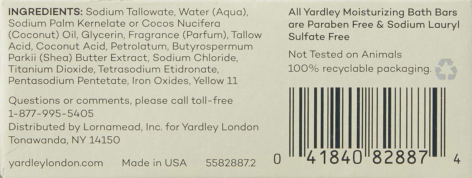 Yardley London Lemon Verbena With Shea Butter & Pure Citrus Oil Moisturizing Bar 4.25 ozr. Naturally moisturizing bath bar. With natural shea butter & pure citrus oils. Softens & invigorates. Since 1770 the House of Yardley London has created fine luxury soaps worthy of royalty. Today the tradition continues with Yardley's Lemon Verbena Naturally Moisturizing Bath Bar. Restore your skin's moisture balance and feel ready-to-go with pure citrus oils and natural shea butter a unique combination of wholesome goodness that softens tones and uplifts. This luxurious bar unlocks a fragrant medley so refreshing you'll want an extra bar for your powder room. All Yardley Naturally Moisturizing Bath Bars are paraben free & sodium lauryl sulfate free. Yardley London continues William Yardley's 17th century tradition - creating fine luxury soaps using the freshest ingredients and fragrances inspired by nature. Enjoy the experience. Not tested on animals Made in USA.