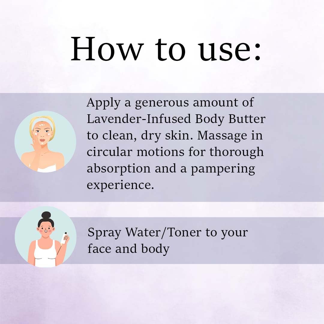 • Multi-Purpose Beauty Essentials: Transform your skincare routine with this versatile combo - use the Lavender Water as a refreshing face mist or toner while the Lavender Body Butter provides intense skin hydration.