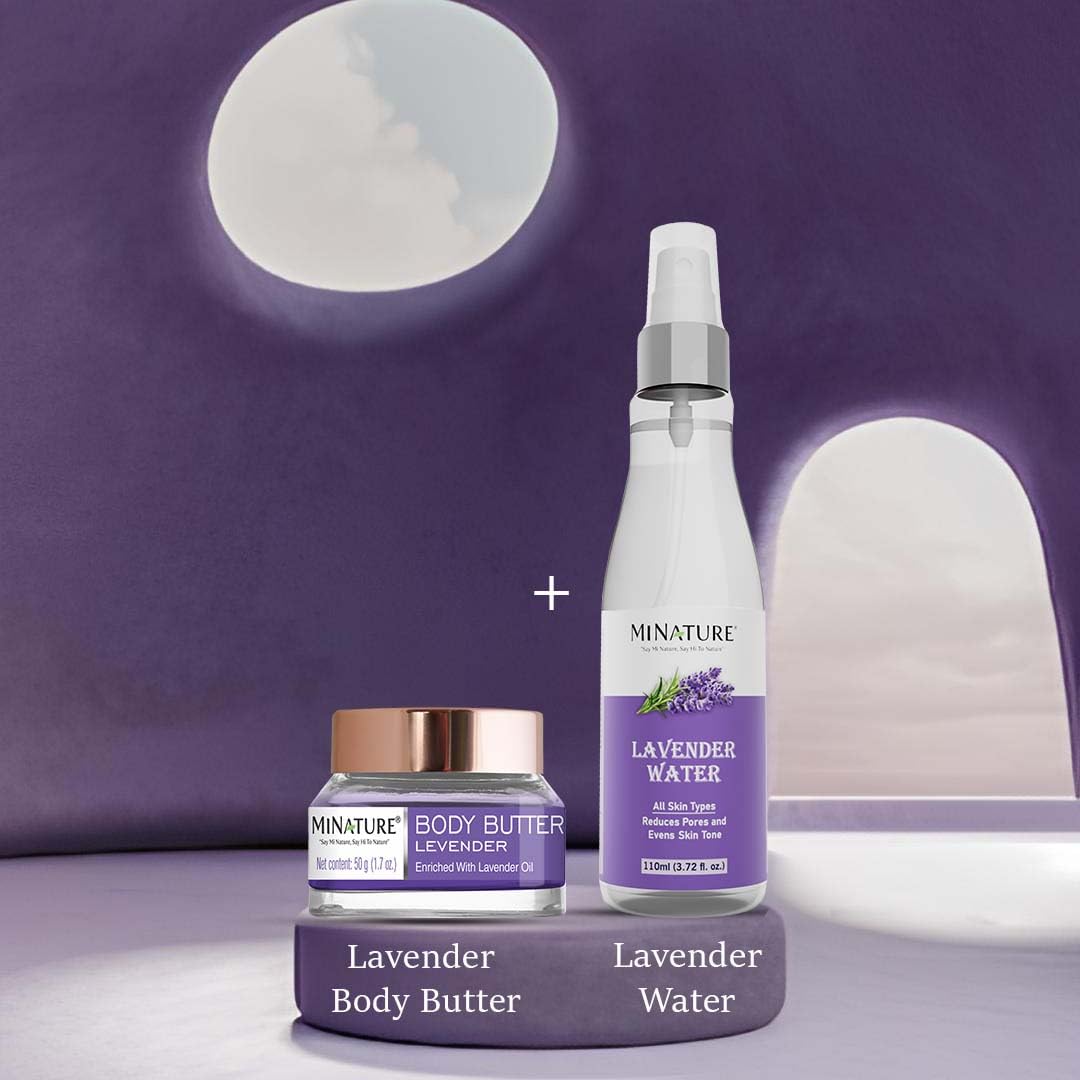 MINATURE Combo Of Lavender water & Lavender body butterKEY FEATURES Multi-Purpose Beauty Essentials:Transform your skincare regimen with our Lavender Water and Body Butter combo designed to cater to all your skincare needs.Hydrating Formula: Bid farewell to dry lackluster skin! Our Lavender Water acts as a hydrating toner infusing your skin with moisture All-Day Moisture: Formulated with the calming essence of lavender our Lavender Body Butter is the perfect face moisturizer and cream for all skin types.Natural Ingredients: At Mi Nature we believe in the power of nature to enhance your beauty routine. Our Lavender Water and Body Butter combo is crafted with pure lavender extract and other natural ingredients free from harsh chemicals and additives. Elevate Your Self-Care Routine: Unwind and rejuvenate your skin with the soothing benefits of lavender. With our Best-quality Lavender Water and Body Butter combo