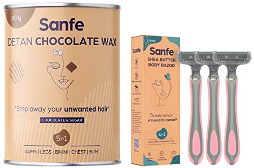 Sanfe Detan Chocolate Wax for Smooth Hair Removal - 600gm with chocolate extracts | For all skin types | Removes Tan Dead Skin | For Arms Legs and Full bodyLESS PAINFUL HAIR REMOVAL: Gives you effective removal of hair from roots without being too painful or harsh on the skin. SOFT AND SMOOTH: Skin Moisture and hydrates to give a smooth finish and soft feel. HYDRATING FORMULA: Hydrating and nourishing formula that is suitable for even the most sensitive skin. EASY APPLICATION: Easy to apply formula that also guarantees you better waxing results. SKIN -FRIENDLY: Suitable for normal dry and even sensitive skin.Sanfe Shea Butter Body Razor for Women's Hair Removal - Pack of 3 with New No Cut Technology | Comfortable Handle | Instant & Pain Free Remover | Protective Sleeve and Anti-Slip GripNo more waiting or shying in the salons for full-body hair removal. Sanfe's Shea Butter Body Razor is a DIY solution to get a buttery smooth skin at shower time.