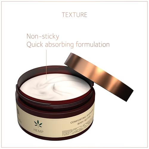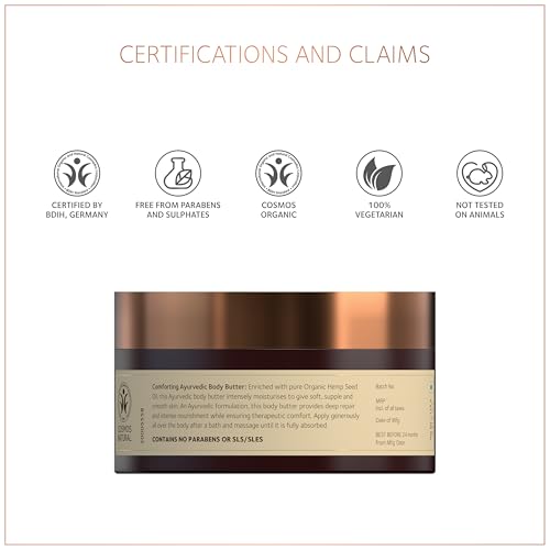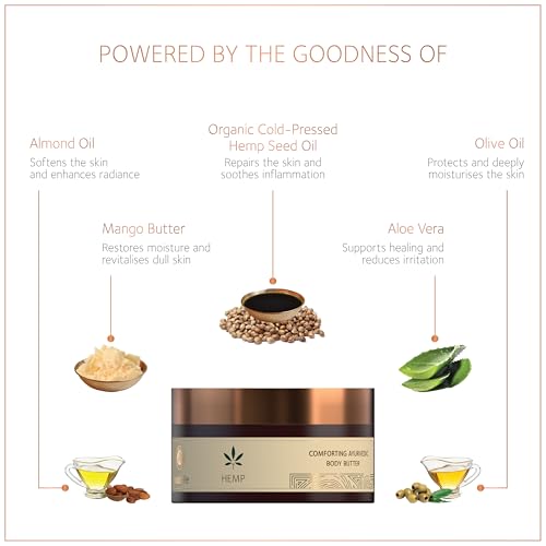 Enriched with 100% Pure Organic Hemp Seed Oil the Hemp Comforting Ayurvedic Body Butter intensely moisturises to give soft supple and smooth skin. An Ayurvedic formulation this body butter provides deep repair and intense nourishment while ensuring therapeutic comfort. Cold-pressed Hemp Seed Oil profoundly repairs skin and soothes inflammation. Also enriched with Almond Oil Olive Oil and Mango Butter for luxurious hydration and silken skin. Regular use enhances skin elasticity alleviates dryness and flaking and promotes cell regeneration for damaged skin. - 100% Organic Ayurvedic formulation - Non-sticky Fast-absorbing texture - Deeply moisturises & nourishes the skin - Soothes and alleviates discomfort caused by dryness - Suitable for all skin types - 100% Vegetarian - Certified âCOSMOS NATURALâ by BDIH GERMANY - Not tested on animals - Does NOT contain Parabens Silicones Lead DEA/TEA Phthalates SLS/SLES Mineral Oil Petrolatum Fragrance