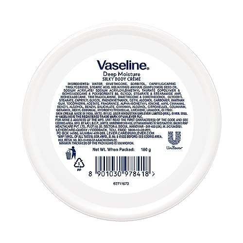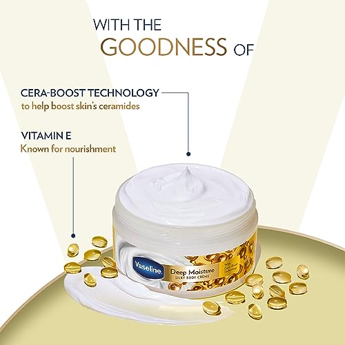 Unlock the secret to beautifully hydrated and radiant skin with Vaseline Deep Moisture Silky Body Crème Butter. Treat yourself to this indulgent and effective skincare product and experience the joy of healthy glowing skin every day. This innovative formula infused with Cera-Boost Technology and Vitamin E boosts the skinâs ceramides and strengthen the skin barrier giving moisturized radiant skin making it an essential addition to your skincare routine. Designed to deeply hydrate and nourish your skin this body crème is velvety soft ensuring 24hrs Moisturization without leaving a greasy residue. Vaseline Deep Moisture Silky Body Crème Butter dryness becomes a thing of the past. The rich and luxurious texture melts into your skin delivering intense moisturization to leave it feeling soft silky and revitalized. Since its creation in 1870 Vaseline has been effectively treating dry skin for over 150 years. As India's No. 1 Body Lotion Brand* (MAT July 2020) Vaseline presents this range of Body Crème comprising of products such as: Vaseline Light Hydrate Gel Body Crème Butter for users who prefer a light feather like sensorial cream. Vaseline Cocoa Glow Whipped Body Butter for users who prefer a rich thick sensory cream. Vaseline Deep Moisture Silky Body Crème Butter for users who prefer a silky-smooth cream.