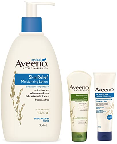Aveeno Skin Relief Moisturizing Lotion 354 mlAveeno skin relief moisturizing lotion is a fast absorbing body lotion that starts to work immediately to nourish and restore essential moisture so your skin feels softer and healthier. Formulated with active naturals triple oat complex with oat oil and natural shea butter this lotion for sensitive skin is clinically shown to relieve soothe extra-dry skin while moisturizing it for a full 24 hours. As a skin protectant active ingredient oatmeal can help restore skin's normal ph and aid in the maintenance of skin's moisture barrier to help prevent and protect dry skin. Aveeno skin relief moisturizing lotion is also fragrance-free steroid-free and gentle enough for sensitive skin. From humble beginnings in 1945 the story of the aveeno brand has been one of discovery. By unlocking natureâs powers through scientific advances they have discovered ways to nurture and transform skin and hair to an enhanced state of natural health and beauty. Aveeno uses select natural ingredients because of their advanced benefits. These are called active naturals natural ingredients uniquely formulated to deliver visible results. Scientists at aveeno follow highest standards of ingredient selection formulation and manufacturing with processes that retain the strength and purity of such ingredients. Active Ingredients: Dimethicone 1.2%; Inactive Ingredients: Water glycerin distearyldimonium chloride petrolatum isopropyl palmitate cetyl alcohol avena sativa (oat) kernel flour benzyl alcohol avena sativa (oat) kernel oil steareth-20 avena sativa (oat) kernel extract butyrospermum parkii (shea) butter sodium chlorideAveeno Daily Moisturising Lotion 71 mlAveeno daily moisturizing lotion is clinically proven to improve the health of dry skin in 1 day with significant improvement in 2 weeks. Formulated with active naturals colloidal oatmeal and rich emollients this nourishing lotion helps prevent and protect dry skin for a full 24 hours. As a skin protectant active ingredient oatmeal can help restore skin's normal ph. and aid in the maintenance of skin's moisture barrier to help prevent and protect dry skin. Aveeno daily moisturising lotion leaves your skin feeling soft smooth and naturally healthy looking and is gentle enough for everyday use. Itâs also fragrance free non-greasy and non-comedogenic. From humble beginnings in 1945 the story of the Aveeno brand has been one of discovery. By unlocking natureâs powers through scientific advances they have discovered ways to nurture and transform skin and hair to an enhanced state of natural health and beauty. Aveeno uses select natural ingredients because of their advanced benefits. These are called active naturals natural ingredients uniquely formulated to deliver visible results. Scientists at Aveeno follow highest standards of ingredient selection formulation and manufacturing with processes that retain the strength and purity of such ingredients.Aveeno Skin Relief Lotion For Sensitive Skin White 71 gAveeno skin relief moisturizing lotion is a fast absorbing body lotion that starts to work immediately to nourish & restore essential moisture so your skin feels softer and healthier. Formulated with active naturals triple oat complex with oat oil and natural shea butter.