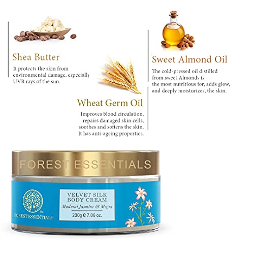 Brand: Forest EssentialsFeatures:Organic cold pressed oils are usedHigh nutrient value with potent Ayurvedic ingredients100 percent natural and free from any parabens petroleum GMO sulphates formaldehyde PEGS artificial colour synthetic fragrance and animal testingBinding: Health and BeautyRelease Date: 01-01-2017Part Number: 9340Details: The Forest Essentials Velvet Silk Body Cream Madurai Jasmine & Mogra deeply nourishes the skin. It contains Sweet Almond Oil which adds glow and Wheat Germ Oil that repairs the skin leaving it soft and supple.The uplifting fragrance of the Jasmine and Mogra extracts relieves stress and soothes sensitive skin.EAN: 8904153393403Package Dimensions: 4.0 x 4.0 x 2.0 inches