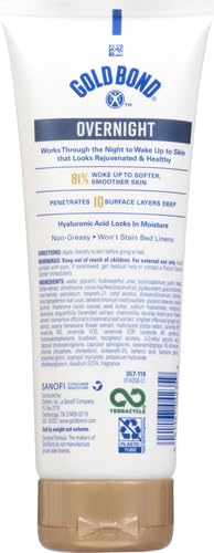 Hydrate and revitalize the look of skin while you sleep with Gold Bond Overnight Deep Moisturizing Skin Therapy Lotion. This overnight lotion contains hyaluronic acid to lock in moisture while you sleep so you wake up to skin that looks and feels rejuvenated. Its deep moisturizing formula with seven moisturizers and three vitamins reveals soft supple skin. The lotion is nongreasy so applying it before bed will not stain or damage your bed sheets. Breathe in the calming lavender scent and rest assured that the thick cream is working to revitalize the look of your skin while you sleep.