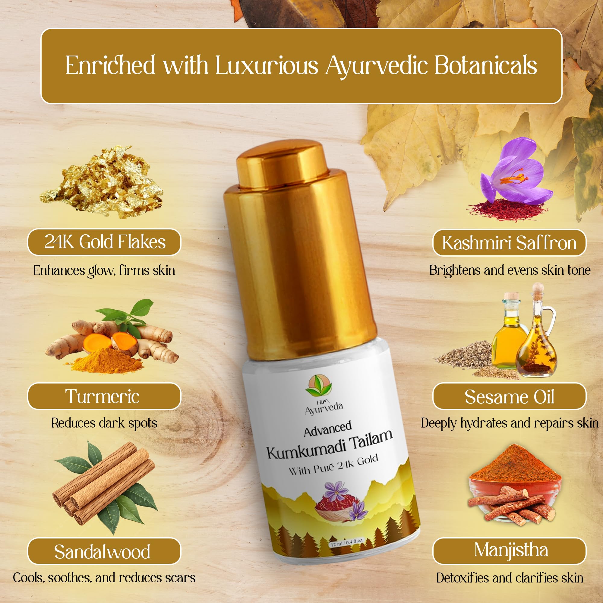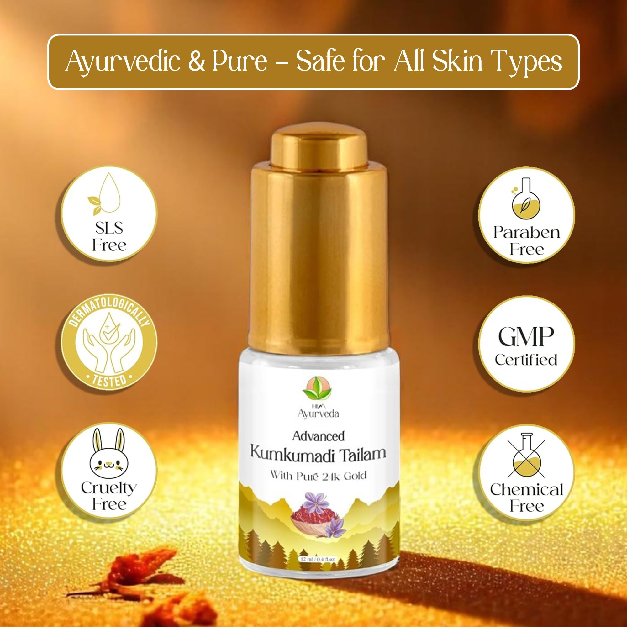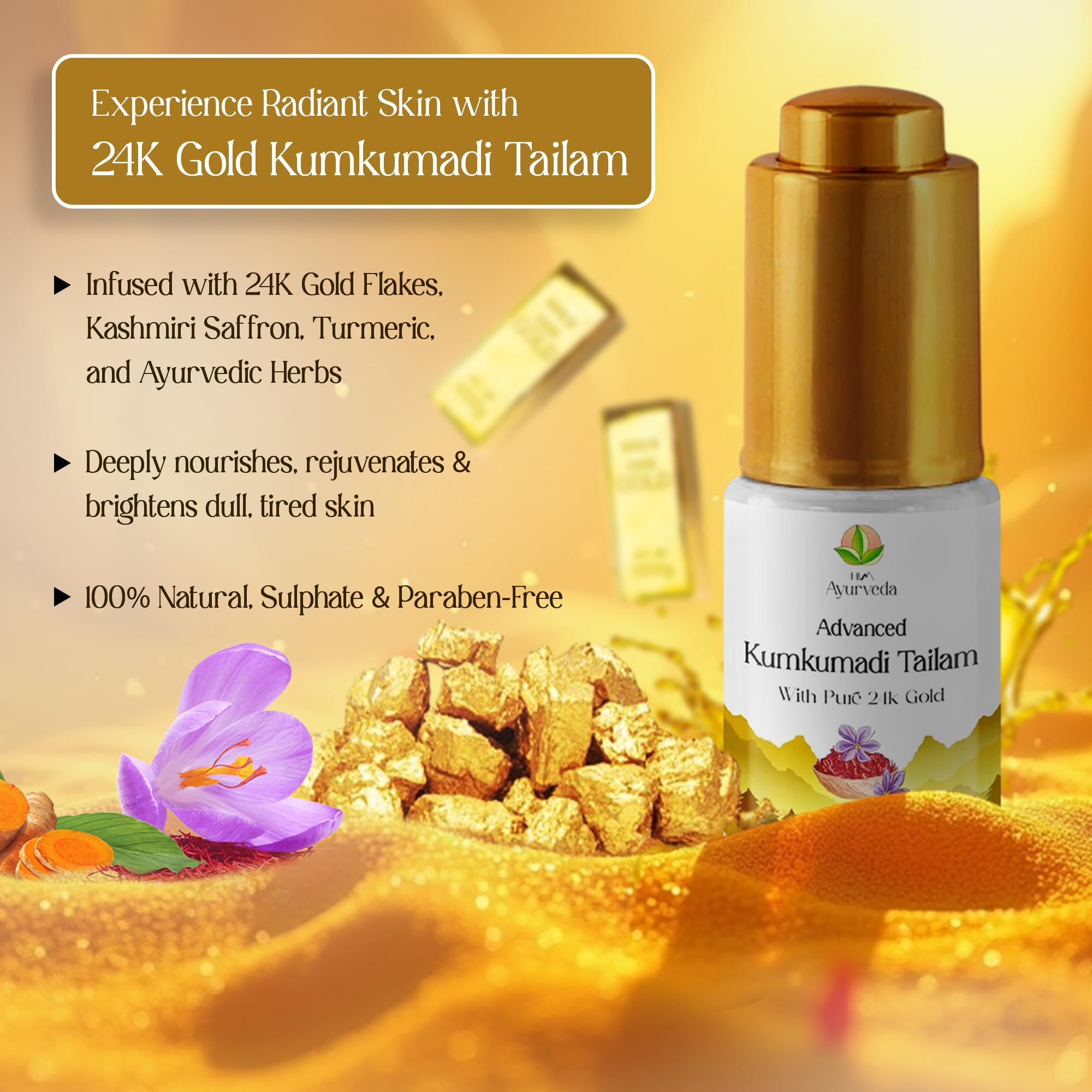 HIM Ayurveda Advanced 24K Gold Ayurvedic Kumkumadi Oil (Tailam)|Natural and Organic Herbs Kashmiri Saffron and Pure Gold Flakes|Advanced Ayurvedic Formulation To Reduce Dark Spots Blemishes and Sagging Skin| 12ML
