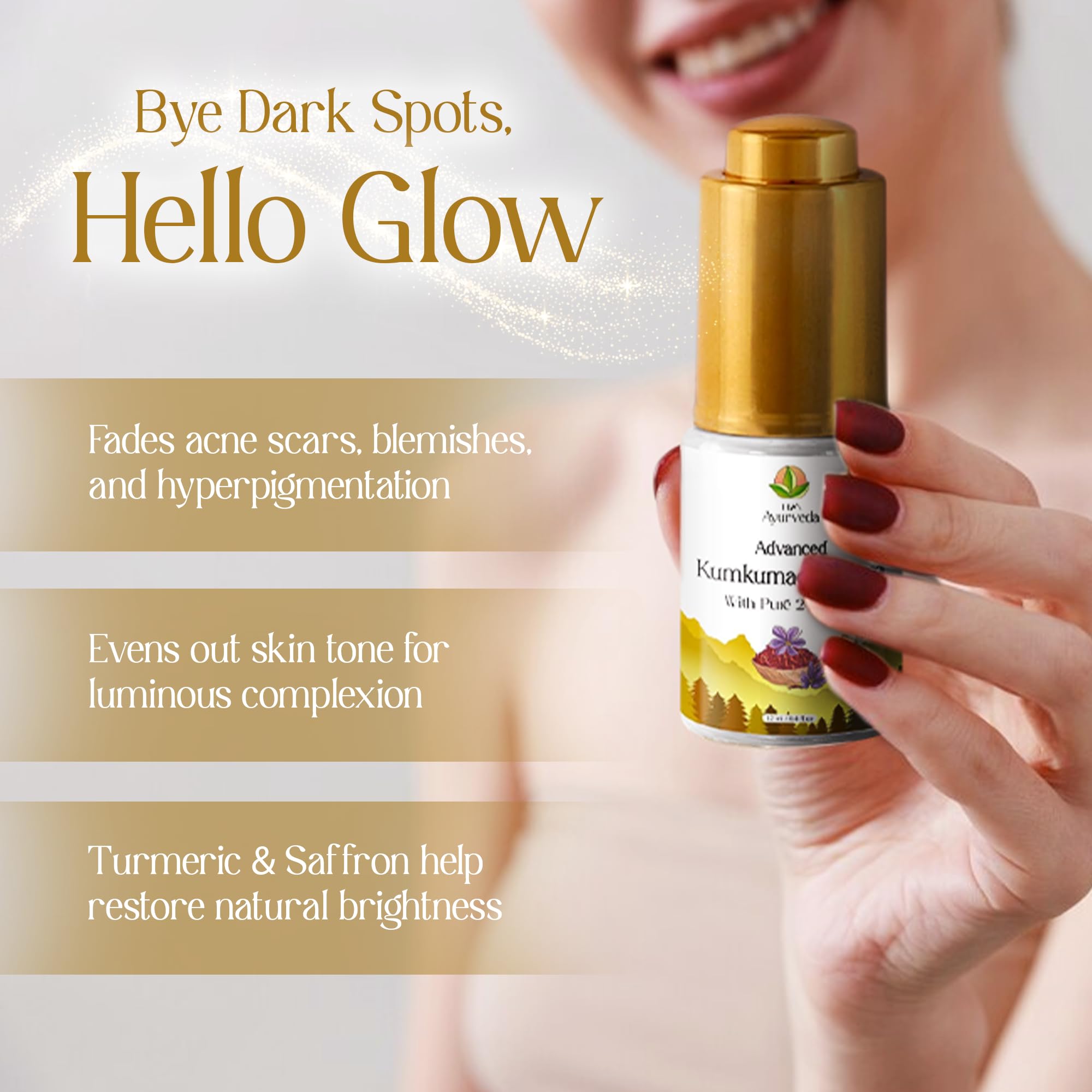 Skin Brightening & Spot Reduction: Infused with Ayurvedic herbs this Kumkumadi Tailam face oil targets dark spots hyperpigmentation acne scars and uneven skin tone leaving you with a clear luminous and naturally glowing complexion.