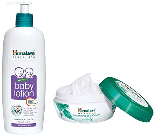 Himalaya Baby Body Lotion For All Skin Types (400 ml)Himalaya Baby Body Lotion For All Skin Types (400 ml) Gentle Daily Care Lotion Himalaya baby lotion is formulated from natural ingredients to keep your baby's skin soft and protected. Dermatologically tested it is gentle and safe for use on new born baby skin as well. Effective for dry and scaly skin this Himalaya herbals body lotion moisturizes and nourishes your young one's skin with its daily use. Apply and massage it gently on your baby's body and enjoy this beautiful bonding moment with your baby that's sure to last forever. Free from harsh chemicals this mild baby lotion has soothing properties to keep your infant's skin cool and lustrous. Protect baby's tender and sensitive skin with this soft and smooth Himalaya herbals baby lotion and feel the difference. Nature's Care for Your Little One Infused with the essence of Olive oil Almond oil and Licorice this baby lotion from Himalaya herbals has antimicrobial properties that protects your child from multiple infections. Vitamin E enriched Olive oil nourishes the skin and prevents any outbursts while Almond oil a rich source of Vitamin A softens the skin tone and is highly effective against infections. It also contributes to overall growth and bone development of your child. Licorice is yet another anti-inflammatory and anti-germicidal herb that keeps your baby's skin cool and relieves it from itching swelling and redness efficaciously. Buy this Himalaya baby lotion 400ml pack online and pamper your baby with its natural goodness for a healthy moisturized soft and supple skin. Weight: 400 ml Contents: Olive oil Almond oil Licorice and other natural ingredients Effective for: Dry and scaly skin Itchiness Rashes and SwellingHimalaya Nourishing Skin Cream 200mlHimalaya's nourishing skin cream is a light nongreasy daily use cream which provides all day moisturizing nourishment and protection. The cream is blended with the extracts of aloe vera winter cherry Indian kino tree and Indian pennywort which protect your skin from pollution and dry weather providing nourishment and moisture.