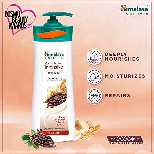 Himalaya Herbals Cocoa Butter Intensive Body Lotion 400mlA daily use intense moisturizer with a luxurious blend of nourishing and deep penetrating natural ingredients. Details Himalaya's Intensive Moisturizing Body Lotion is a specially formulated body lotion for dry skin. It intensely moisturizes softens and smoothes your skin. Cocoa Butter's deep penetrating natural ingredients help repair nourish skin as well as making it supple. The moisturizer is enriched with the goodness of Cocoa Butter Olive Wheatgerm and Grape seed Oil which replenishes the lost moisture in dry skin. Naturally derived ingredients restore skin's elasticity leaving it softer and toned than before.Qty 400mlHimalaya Nourishing Body Lotion 400mlA daily use non-greasy and quick absorbing body lotion that provides your skin essential nourishment. Details Himalayas Nourishing Body Lotion combines 100% herbal ingredients to restore our bodys water content as varying weather conditions makes our skin lose its moisture. The non-greasy body lotion leaves skin feeling soft supple and toned. Blended with all natural ingredients such as Aloe Vera Apricot and Wheat germ oil which are known for intense hydrating properties the body lotion deeply penetrates into the skin to moisturize it fully. Qty 400ml