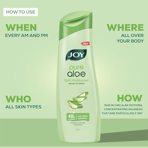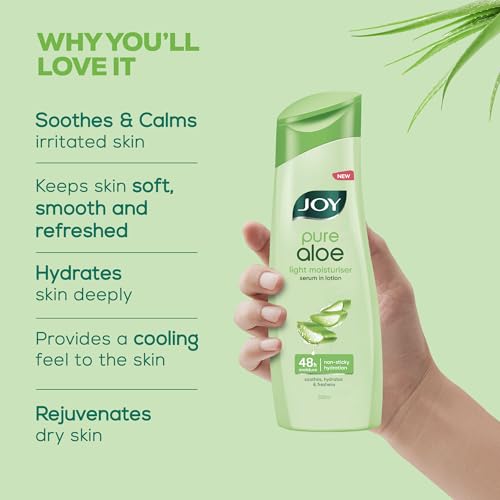 Joy Pure Aloe Multi-Benefit Moisturizing Body Lotion is a light moisturising body lotion for hydration and smooth skin. It contains soothing aloe vera which reduces irritation redness and other sun related skin problems. Light yet creamy texture leaves skin feeling soft fresh and cared for. The 6-pronged action results in smoother younger skin.