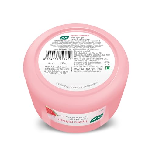 HomeBeautyBodyBody CareBody Lotions & MoisturizersJoy Hydra Refresh Ultra-Light Oil-Free Gel Moisturizer with Watermelon & Vitamin E for Face & Body (250ml) | Quick-Absorbing, Non-Sticky Hydration for Oily & Normal Skin