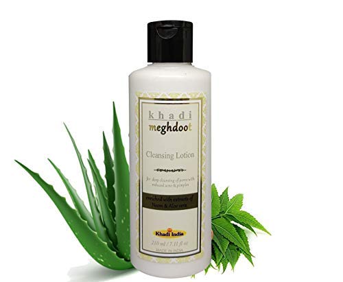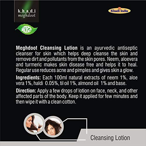Khadi Meghdoot Cleansing Lotion is an Ayurvedic skin care essential that gently removes dirt oil and impurities while maintaining the skin’s natural moisture balance. Infused with herbal ingredients like aloe vera and other natural extracts this gentle cleanser deeply purifies your skin without causing dryness or irritation.Perfect for daily use it cleanses clogged pores removes makeup and refreshes the skin leaving it soft smooth and naturally radiant. Ideal for all skin types this chemical free cleanser is suitable for both men and women and is especially beneficial for those with oily or sensitive skin.It is an ayurvedic antiseptic cleanser for skin which helps deep cleanse the skin and remove dirt and pollutants from the skin pores. Neem aloevera and turmeric makes skin disease free and helps it to heal. Regular use reduces acne and pimples and gives skin a glow.