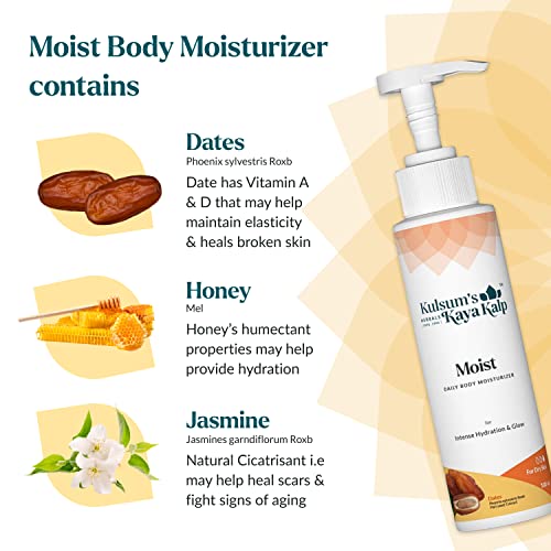 • Kulsum's Kaya Kalp Herbals Moist is a daily body moisturizer that is suitable for dry skin. It is enriched with dates honey and jasmine.