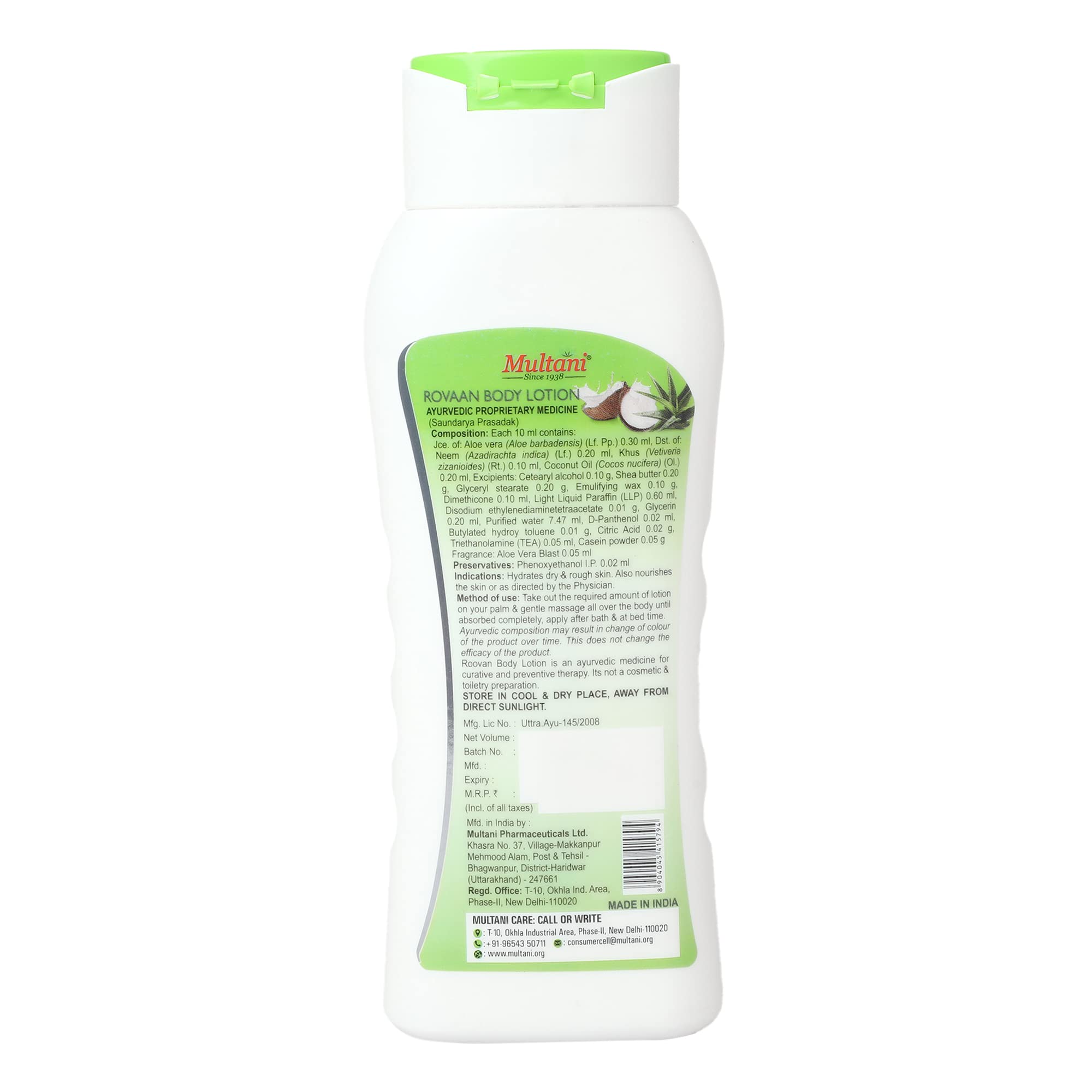 Ingredients Features Multani Rovaan Body Lotion - Blended With Perfection Rovaan Body Lotion Has All Natural Aloe Vera Neem & Coconut Oil. High Concentrations Pure Ingredients Make Shea Butter An Ideal Ingredient For Softening Skin. Shea Butter Also Has A