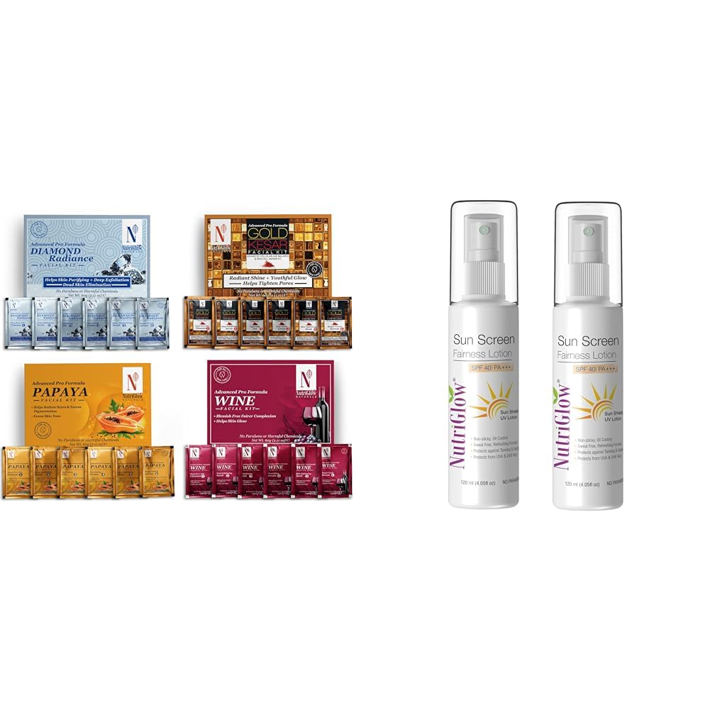 NutriGlow NATURAL'S Advanced Pro Formula Cleanup Kit All Type of Skin Solution for men & women 60 gm (Pack of 4)Elevate your skincare routine with our Combo of 4 Facial Kits curated to deliver professional-quality results in the comfort of your home. Experience the luxury of Diamond Radiance the indulgence of Wine the revitalization of Papaya and the luxury of Gold Kesar all in one comprehensive set. Each kit is meticulously crafted with premium ingredients to address various skin concerns from dullness to dryness ensuring a radiant complexion after each use. Pamper yourself with spa-like treatments without the hassle of salon appointments. Whether you want to hydrate or rejuvenate our facial kits offer versatile solutions for all skin types. Treat yourself or surprise a loved one with this convenient and economical pack designed to elevate your skincare regimen to new heights of indulgence.NutriGlow Sunscreen Lotion SPF 40 & PA+++ Non-Greasy with Broad Spectrum UVA & UVB Blue Light Protection for Men & Women All Skin Types 120ml (Pack of 2)Sun protection by using NUTRIGLOW sun screen fairness lotion SPF 40 pa+++. composed of calendula extracts and UV filters along with vitamin this whitening milk nourishes and moisturizes your skin.