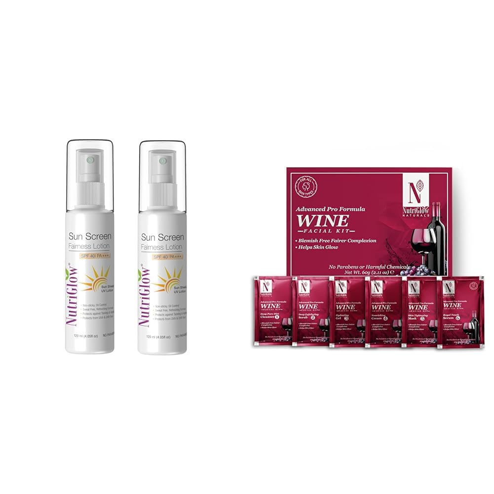 NutriGlow Sunscreen Lotion SPF 40 & PA+++ Non-Greasy with Broad Spectrum UVA & UVB Blue Light Protection for Men & Women All Skin Types 120ml (Pack of 2)Sun protection by using NUTRIGLOW sun screen fairness lotion SPF 40 pa+++. composed of calendula extracts and UV filters along with vitamin this whitening milk nourishes and moisturizes your skin.NutriGlow NATURAL'S Advanced Pro Formula Wine Facial Cleanup Kit With Goodness Of Red Grape Extracts Blemish Free All Type of Skin Solution for men & women 60 GMNutriGlow Wine Facial Kit contains Wine Deep Cleanser-10g Wine Exfoliation Scrub-10g Wine Nourishing Gel-10g Wine Whitening Cream-10g Wine Firming Mask Pack-10g & Wine Serum-10ml which is suitable for both oily & dry skin. Packed with the graciousness of Red Wine & world-class beauty enhancers our Wine Facial Kit is qualified to help you get rid of visible signs of ageing & rejuvenates your skin to give long-lasting glowing skin. Red Wine Toner which contains grape extracts the key ingredient of red wine. Red wine is also known as the Red Elixir of Youth. The cooling blend is made from Red Grape seeds revered since antiquity for its calming and hydrating benefits which works to remove impurities and clarify the complexion for healthier-looking skin. Regular use after cleansing imparts a healthy-looking glow. Benefits: 1. Soothes & Calms Skin- Our Wine Facial Kit has soothing & calming properties that increases the elasticity of the skin. Also it gently increases the radiance by wiping out the impurities from your skin & makes you look picture-perfect. 2. Hydrates & Nourishes Skin- All the beauty enhancers in our wine facial kit are prepared with Red Grape extract which is also known for its hydrating properties apart from making you age better. It will not merely keep your skin moisturized but also will allow your skin to attain its essential oils which will make you even more beautiful. 3. Fights Acne & Removes Blackheads- Wine Deep Cleanser & Wine Exfoliation Scrub in the pack deeply cleanses & exfoliates dead skin. It gently removes blackheads and eradicates scum from the skin therefore prevents acne & pimples from popping on your beautiful skin. 4. Eliminates Visible Signs of Ageing- The combination of Wine Firming Mask Pack & Wine Serum in this facial kit allow the skin to fight against fine lines & wrinkles. It firmly energizes the dull skin cells with antioxidants that make you age better.