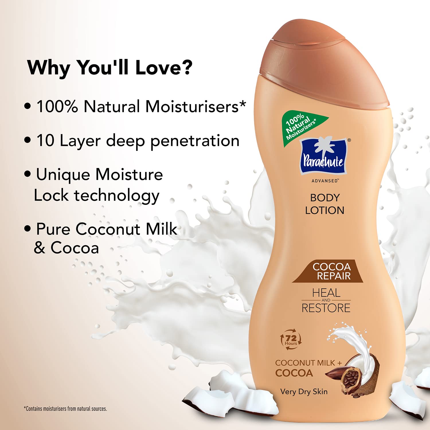 Get naturally beautiful and glowing skin with Parachute Advansed range of body lotion for women and men. This is our original patented formulation especially crafted for Indian Skin Types. Enriched with the goodness of Pure Coconut Milk and Cocoa Butter this product is specially crafted to deliver intensive moisturisation even in harsh winters. Our patented formula with goodness of coconut milk & cocoa butter intensively moisturises nourishes and protects your skin. The formula is crafted especially to provide long lasting moisturisation and repairs dry skin even during harsh winters. This product is made with 100% natural moistrurisers. Unlike many other body lotions this body lotion does not include any ingredients like mineral oil or any petroleum based ingredients (like petroleum Jelly or Liquid paraffin) in the formulation.Parachjute advansed Cocoa repair body lotion is safe for Skin and free from silicones sulphates phthalates or any artificial colours. Ideal for extremely dry/very dry skin Suitable for use by both men and women. Use regularly to have a deeply nourished and moisturised skin.