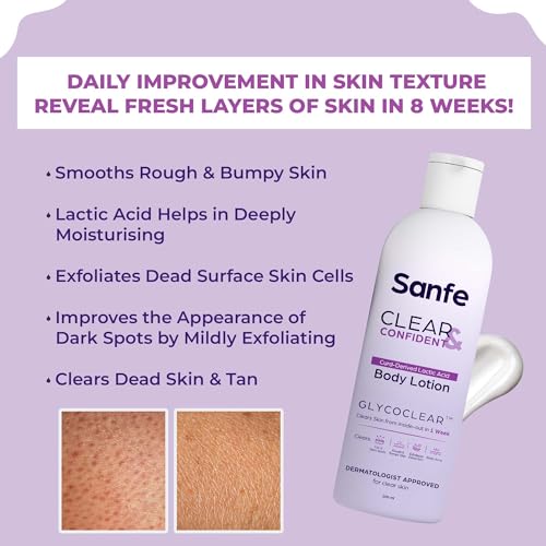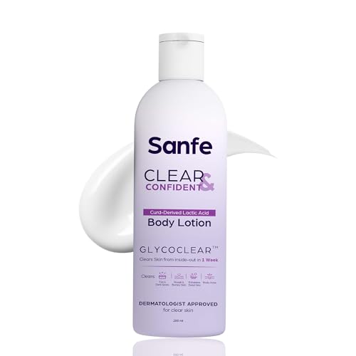 Sanfe Clear & Confident Glycolic Acid Body Lotion | Daily AHA Exfoliation for Rough & Bumpy Skin, Tan, Acne & Strawberry Skin | Niacinnamide, Lactic Acid SALICYLIC ACID 1% W/w | Smooth Skin from 1st Use | 200ml