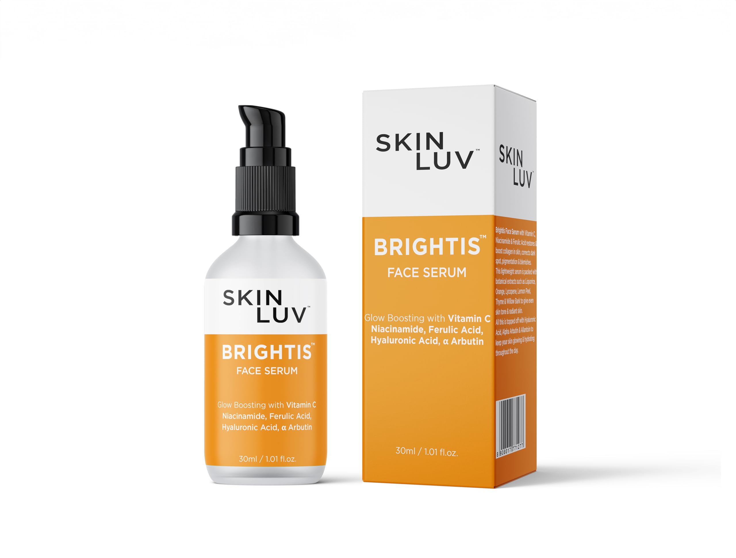 SKINLUV BRIGHTIS Glow Boosting Face Serum with Vitamin C Niacinamide Ferulic Acid Hyaluronic Acid & α Arbutin Experience the radiance of SKINLUV Brightis Face Serum your key to a luminous and revitalized complexion. Formulated with a powerful blend of active ingredients including Vitamin C Niacinamide Ferulic Acid Hyaluronic Acid and Alpha Arbutin this serum is meticulously crafted to deliver a luxurious skincare experience. Unlock the secrets to glowing skin with our advanced formula designed to boost collagen correct dark spots reduce pigmentation and address blemishes. This lightweight serum is packed with botanical extracts such as Liquorice Orange Lycopene Lemon Peel Thyme & Willow Bark to give even skin tone & radiant skin. Benefits of SKINLUV BRIGHTIS Glow Boosting Face Serum Boosts Skin Radiance Restores & Boosts Collagen In Skin Corrects Acne Spots Dark Spot & Pigmentation Gives Even Skin Tone & Remove Blemishes Keep Skin Glowing & Hydrating Through The Day Embrace our Clean Beauty Promise â Paraben Free Sulphate Free Mineral Oil Free Silicone Free Dye Free Cruelty Free Ensuring a wholesome and ethical beauty regimen. Elevate your skincare routine with a serum that not only enhances your natural radiance but also aligns with your commitment to clean beauty. Unveil a brighter healthier and more youthful-looking complexion with SKINLUV Brightis Face Serum. "Your Journey To Radiant Luving Skin Begins Here"