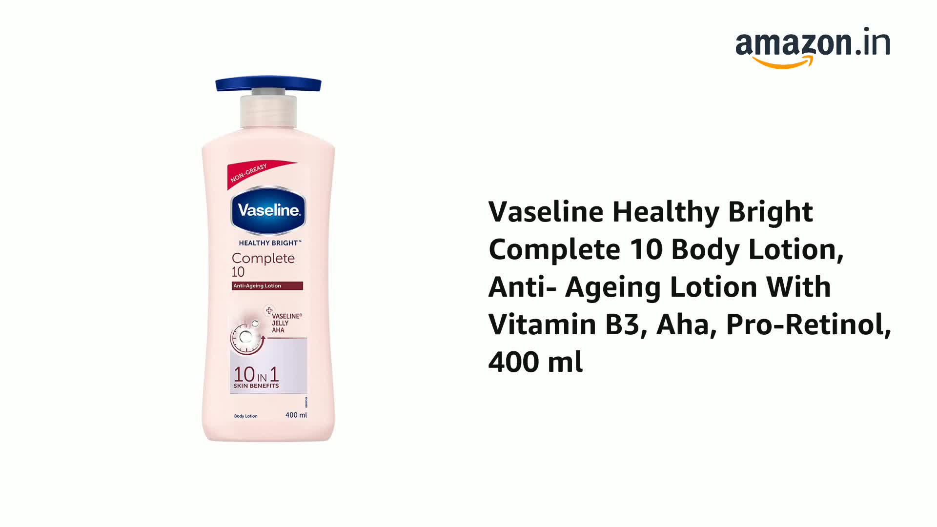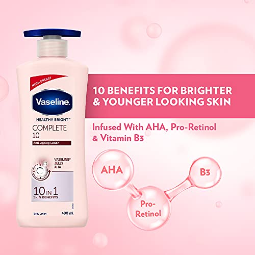 As you start getting older the process of skin renewal slows down and a host of aging signs begin to appear making your skin look dull uneven and even less supple. Vaseline Healthy Bright Complete 10 Body Lotion is specially designed to restore moisture and along with provides 10-in-1 brightening and anti-aging skin benefits.1) VISIBLE SKIN BRIGHTENING 2) EVEN-TONE RESTORATION 3) UVA & UVB PROTECTION 4) DARK MARK REDUCTION 5) RADIANCE BOOST 6) SKIN FEELS FIRM & TIGHT 7) VISIBILY REDUCES FINE LINES 8) HELPS SKIN RENEWAL 9) INTENSE MOISTURIZATION 10) DEEP NOURISHMENT**. Vaseline Healthy Bright Complete 10 body lotion is enriched with micro-droplets of Vaseline Jelly helps heal* skin and triple sunscreens protects your skin's brightness from future damage. Enriched with AHA and pro-retinol which aids in skin renewal along with Vitamin B3 that is known to inhibit the production and transfer of melanin bringing back your skinâs healthy radiance. Use every day to help heal* skin and make it look healthier brighter and younger. Use twice a day for best results. Apply generously over your body and massage till it gets absorbed.*Healing by moisturization of normal dry skin. Action in the epidermal region and within cosmetic domain. **within epidermis.