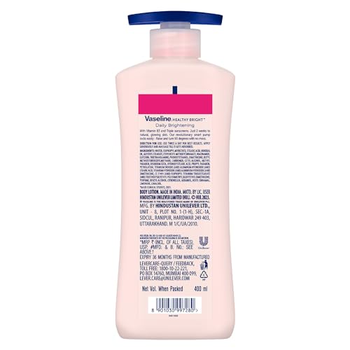 • EASY TO USE PACKAGING: The Vaseline Healthy Bright Daily Brightening Body Lotion (400 ml) has a smart pump quick-lock technology that unlocks and locks with ease without creating any mess making it super convenient to use.