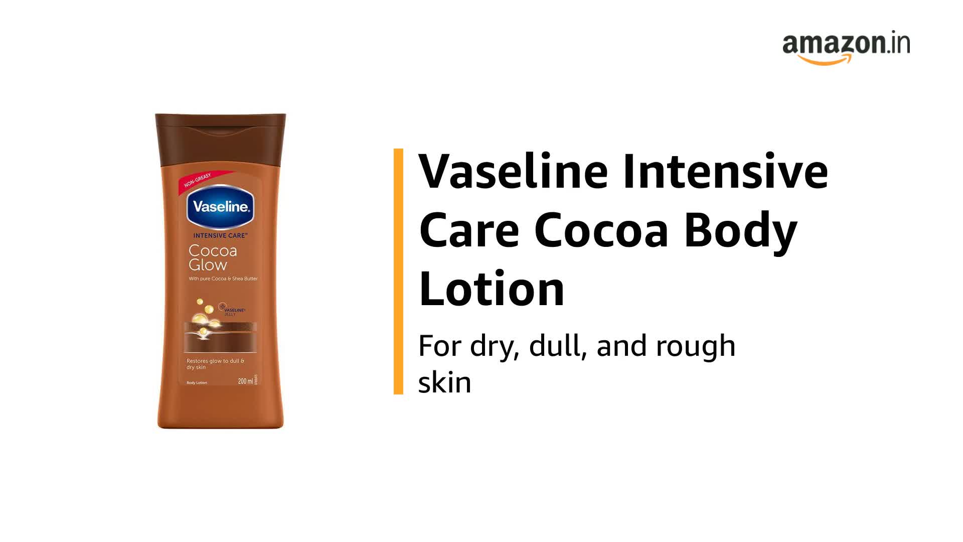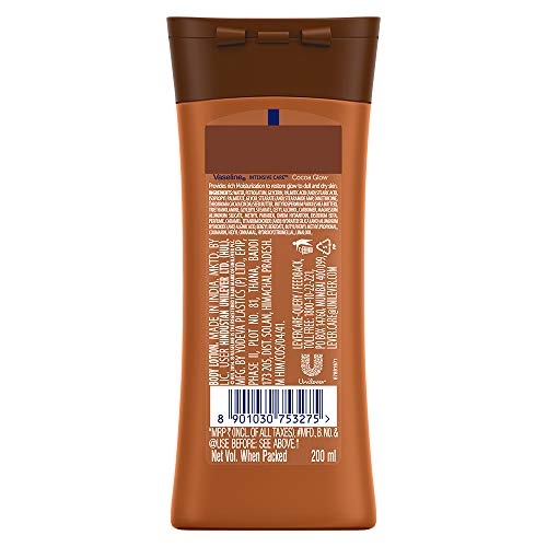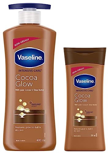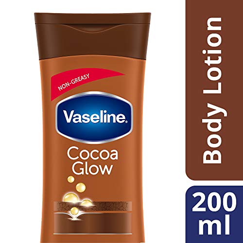 Vaseline Intensive Care Cocoa Glow Body Lotion 200 mlWith daily exposure to environmental triggers skin?s natural moisture barrier can break down allowing for water to escape the skin. The healing micro-droplets of Vaseline Jelly in our lotion for dry skin locks in moisture to allow the skin?s natural barrier to recover. Smooth glowing skin can be yours with Vaseline Intensive Care Cocoa Glow Body Lotion. Your skin won?t feel oily after using this body moisturizer ? the fast absorbing formula moisturizes skin but leaves it feeling soft and glowing without feeling greasy. Vaseline Intensive Care Cocoa Glow Body Lotion helps keep your skin looking healthy and Glowing. Our rich formula combines 100% pure cocoa and shea butters giving your skin a natural glow. Deep Moisturizing Daily Body Lotion Vaseline Cocoa Glow goes beyond basic moisturization. Our Intensive Care range works to helps heal dry skin deep down. Vaseline Intensive Care Cocoa Glow Lotion contains micro-droplets of Vaseline Jelly that lock in moisture. Our moisturizing lotion restores the essential moisture your skin needs with a blend of nourishing ingredients and gives skin a natural healthy glow. Vaseline Intensive Care Cocoa Glow Body Lotion is also infused with cocoa butter and has a pleasant subtle fragrance. Healing by moisturization of normal dry skin. Action in the epidermal region and within cosmetic domain. within epidermis.Vaseline Intensive Care Cocoa Glow Body Lotion 400 mlWith daily exposure to environmental triggers skin?s natural moisture barrier can break down allowing for water to escape the skin. The healing micro-droplets of Vaseline Jelly in our lotion for dry skin locks in moisture to allow the skin?s natural barrier to recover. Smooth glowing skin can be yours with Vaseline Intensive Care Cocoa Glow Body Lotion. Your skin won?t feel oily after using this body moisturizer ? the fast absorbing formula moisturizes skin but leaves it feeling soft and glowing without feeling greasy. Vaseline Intensive Care Cocoa Glow Body Lotion helps keep your skin looking healthy and Glowing. Our rich formula combines 100% pure cocoa and shea butters giving your skin a natural glow. Deep Moisturizing Daily Body Lotion: Vaseline Cocoa Glow goes beyond basic moisturization. Our Intensive Care range works to helps heal dry skin deep down. Vaseline Intensive Care Cocoa Glow Lotion contains micro-droplets of Vaseline Jelly that lock in moisture. Our moisturizing lotion restores the essential moisture your skin needs with a blend of nourishing ingredients and gives skin a natural healthy glow. Vaseline Intensive Care Cocoa Glow Body Lotion is also infused with cocoa butter and has a pleasant subtle fragrance. The Vaseline smart pump unlocks with just a 90? turn. With quick-lock technology the pump locks in the raised position after a quarter turn for easier use and no mess. Healing by moisturization of normal dry skin. Action in the epidermal region and within cosmetic domain. within epidermis.