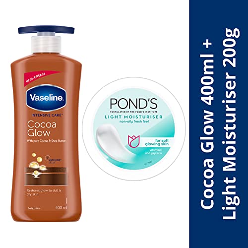 Vaseline Winter Care Combo: Cocoa Glow Lotion, 400Ml With Ponds Light Moisturiser 200Ml, For Soft & Glowing Skin